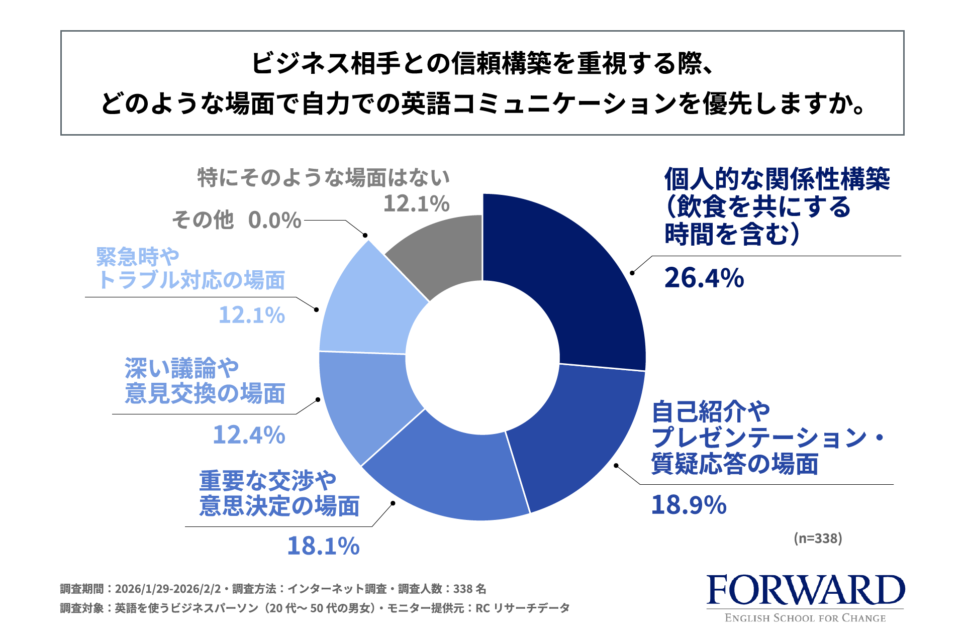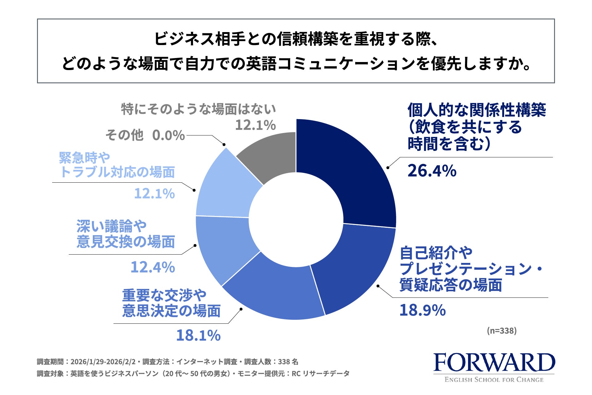 英語を使うビジネスパーソンの4人に1人以上が、ビジネス相手との信頼構築を重視する際に「個人的な関係性を構築する場面」で自力での英語コミュニケーションを優先すると回答