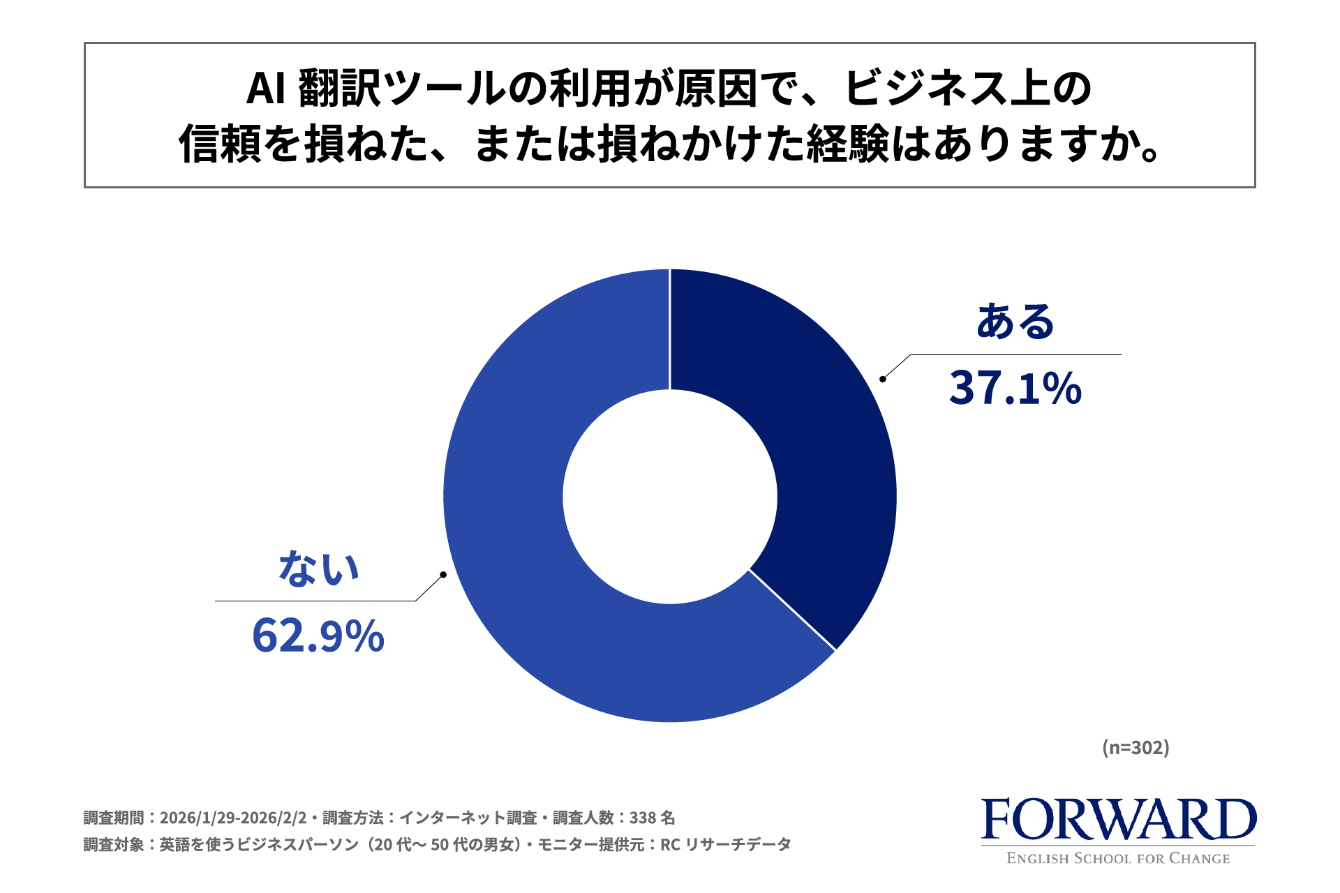 次に、仕事でAI翻訳ツールを利用する英語を使うビジネスパーソンを対象に、「AI翻訳ツールの利用が原因でビジネス上の信頼を損ねた、または損ねかけた経験はあるか」を尋ねる設問への回答では、「ない」が62.9%、「ある」が37.1%という結果になりました。この結果から、仕事でAI翻訳ツールを利用する英語を使うビジネスパーソンの4割弱が、AI翻訳ツールの利用が原因でビジネス上の信頼を損ねた、または損ねかけた経験があることが明らかになりました。
