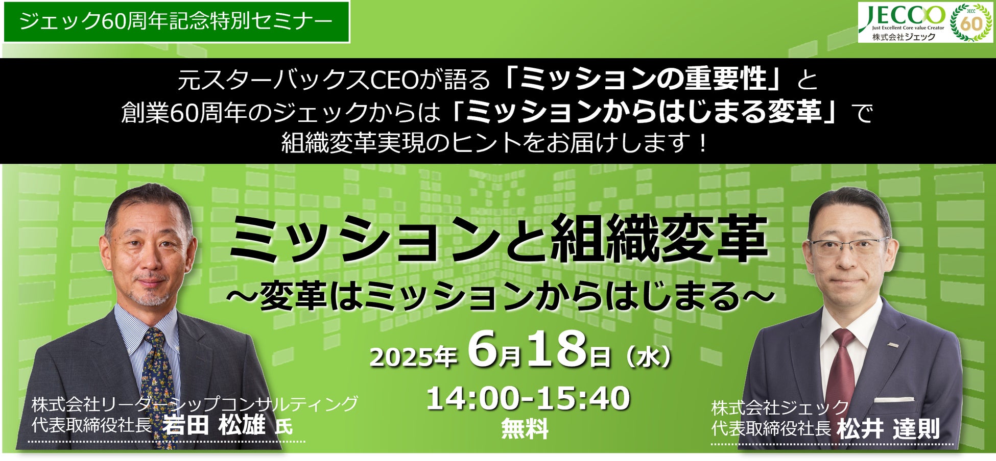2025/6/18(14:00~15:40 無料ウェビナー)60周年記念特別セミナー開催。元スターバックスCEOが語る「ミッションの重要性」とトークセッションで組織変革実現のヒントをお届けします!