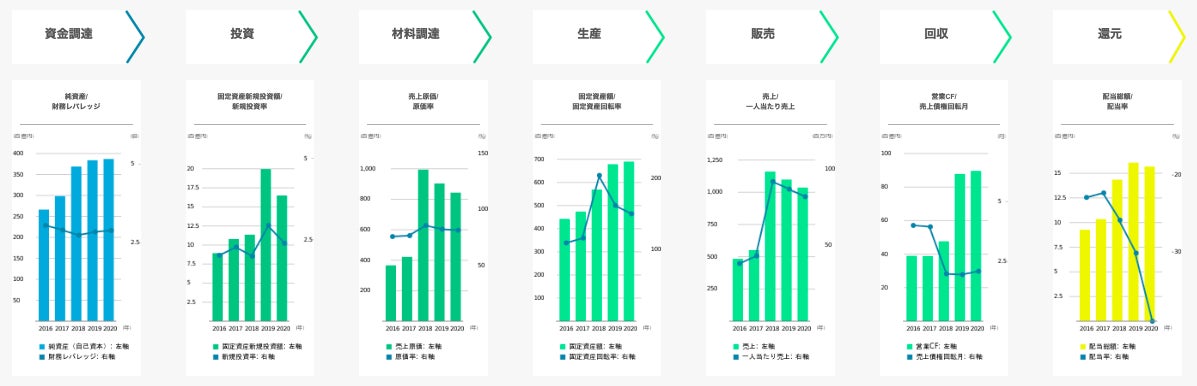 バリューチェーンは8つの項目からなり、それぞれ(1)資金調達 (2)企画開発 (3)投資 (4)材料調達 (5)生産 (6)販売 (7)回収 (8)還元に分解・分析されます。これらは全て“値”ではなく“率”で表示し、異なる企業の比較を可能にしています。