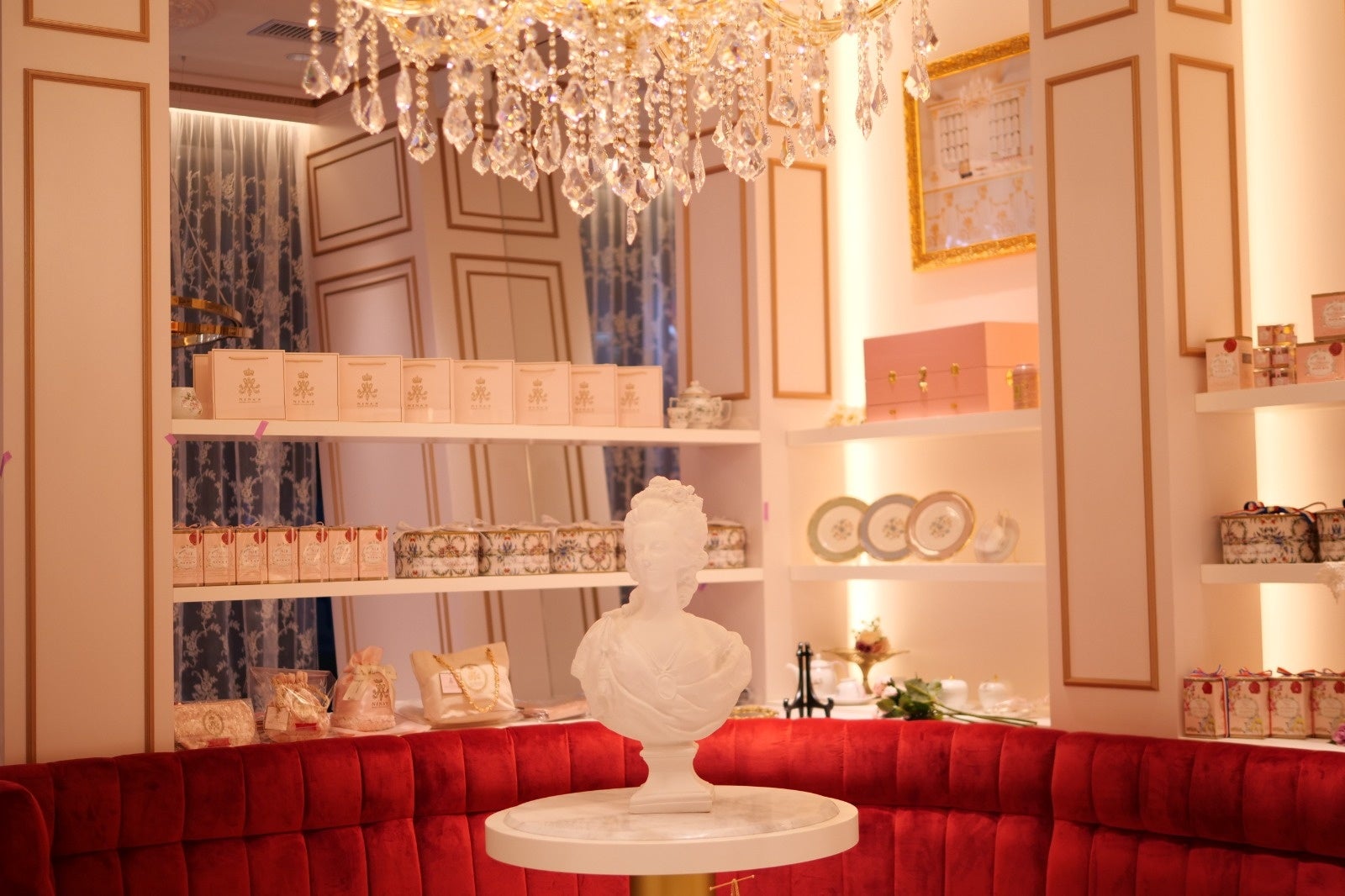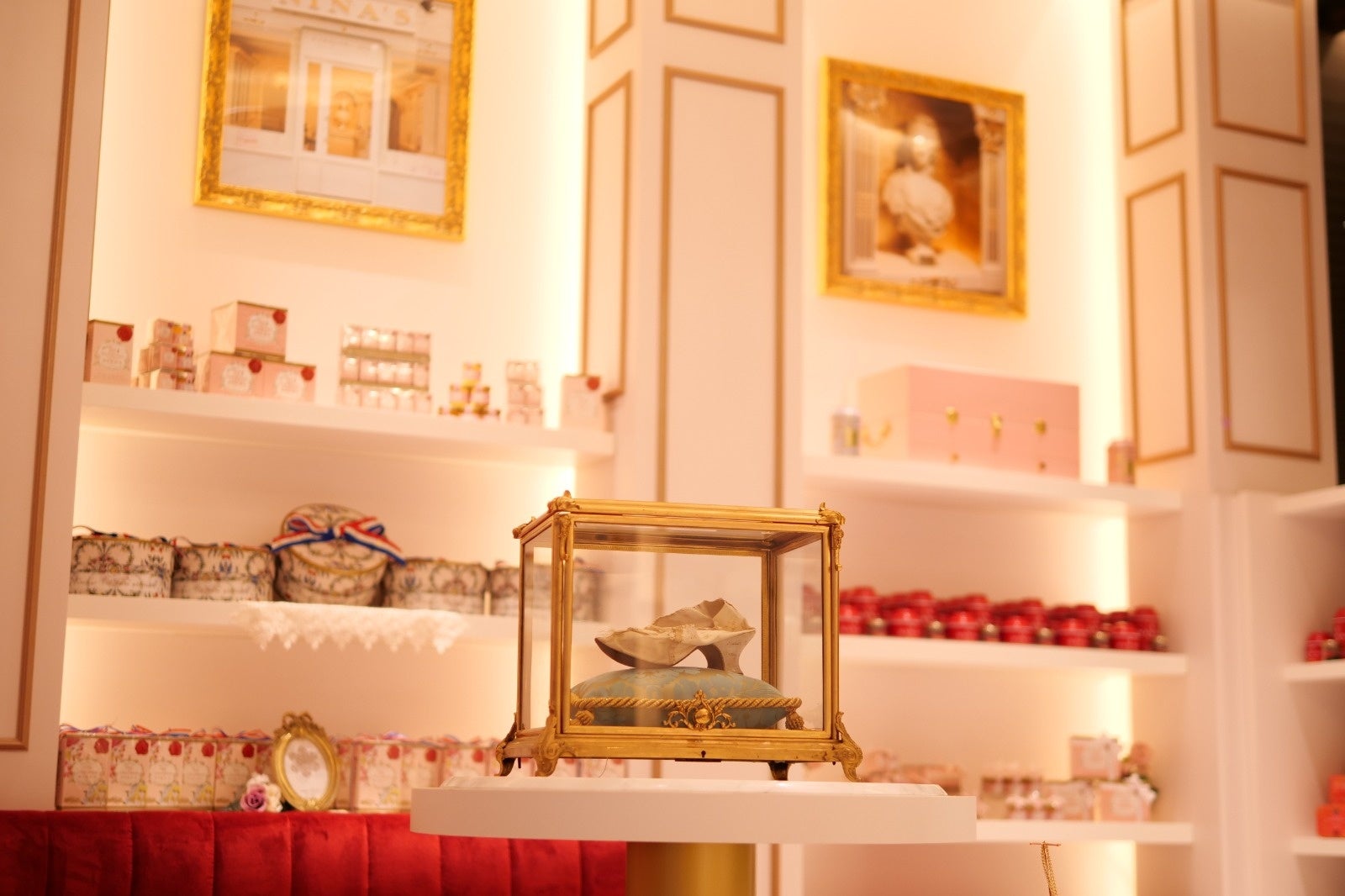 高い天井と大きな窓、ヴェルサイユ宮殿を彷彿とさせるゴールドをメインに取り入れた明るい店内には、ニナス パリ本店、ヴェルサイユ宮殿、王妃マリー・アントワネットが愛したシークレットガーデンのパネルなど、ニナスやフランスの歴史とレガシーの象徴的アイテムも展示しております。王妃マリー・アントワネットのエレガントで華やかな世界に包まれた、より上質な空間をお楽しみください。