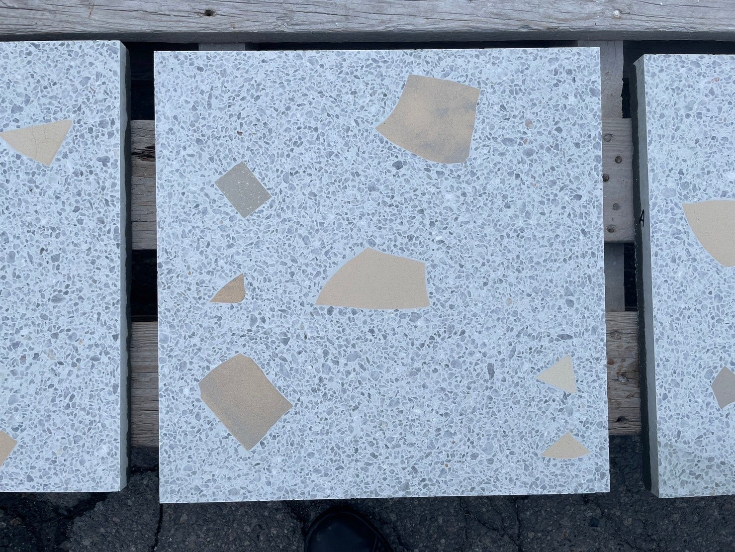 ・床材に陶芸家 釋永陽氏の工房で制作過程で出る廃棄材を練り込んだ特注のテラゾータイル。