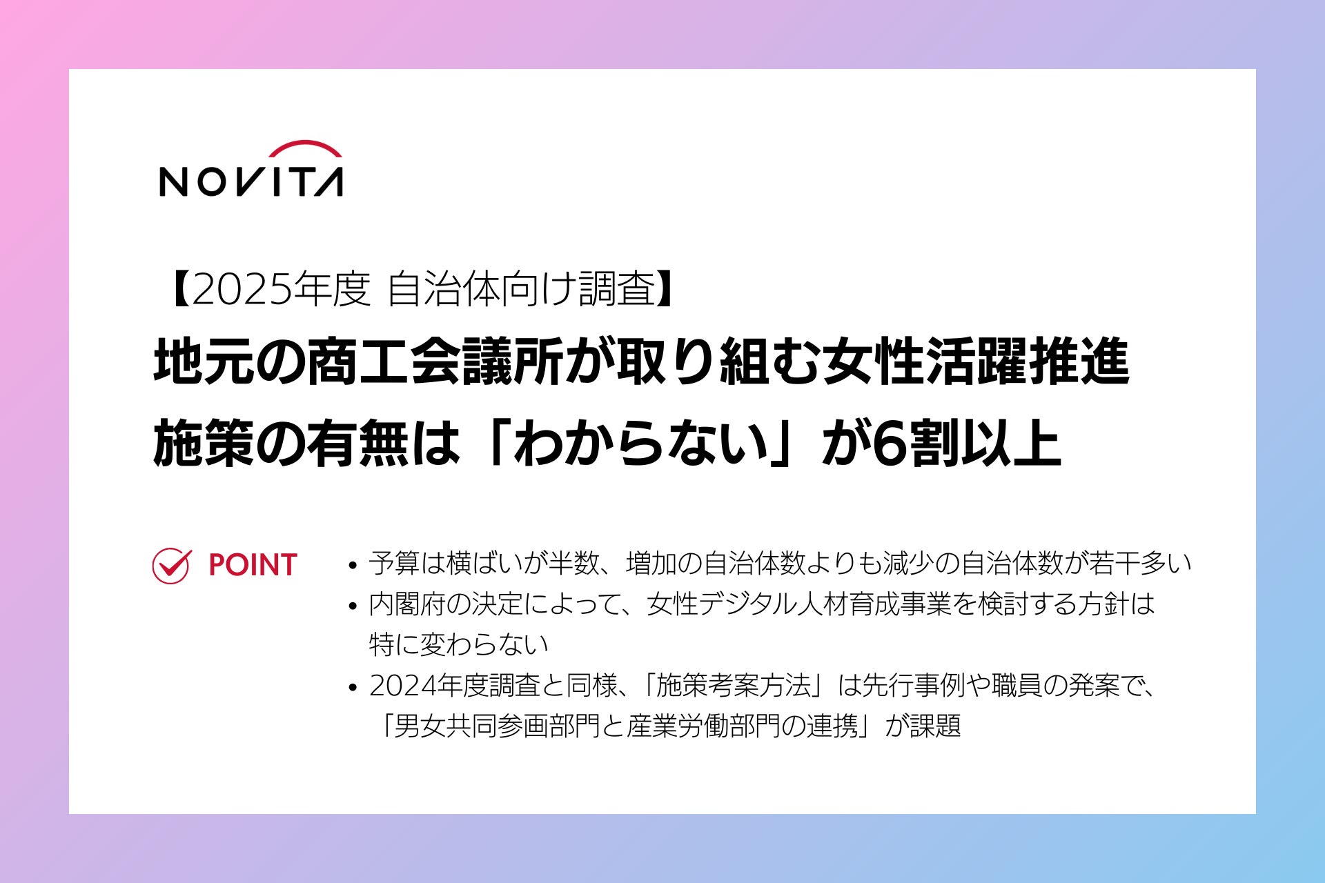 ノヴィータ自身が女性デジタル人材育成の講座提供を行っていることと、また中小企業として自社の「生産性向上・事業成長・働き方改革」のいずれにも良い効果があるように取り組んできた経験をふまえ、各地域で「女性デジタル人材の育成」の事例をさらに増やせるよう背景を探るために、男女共同参画関連部署のある45自治体を対象に、女性活躍支援に関する調査を行いました。