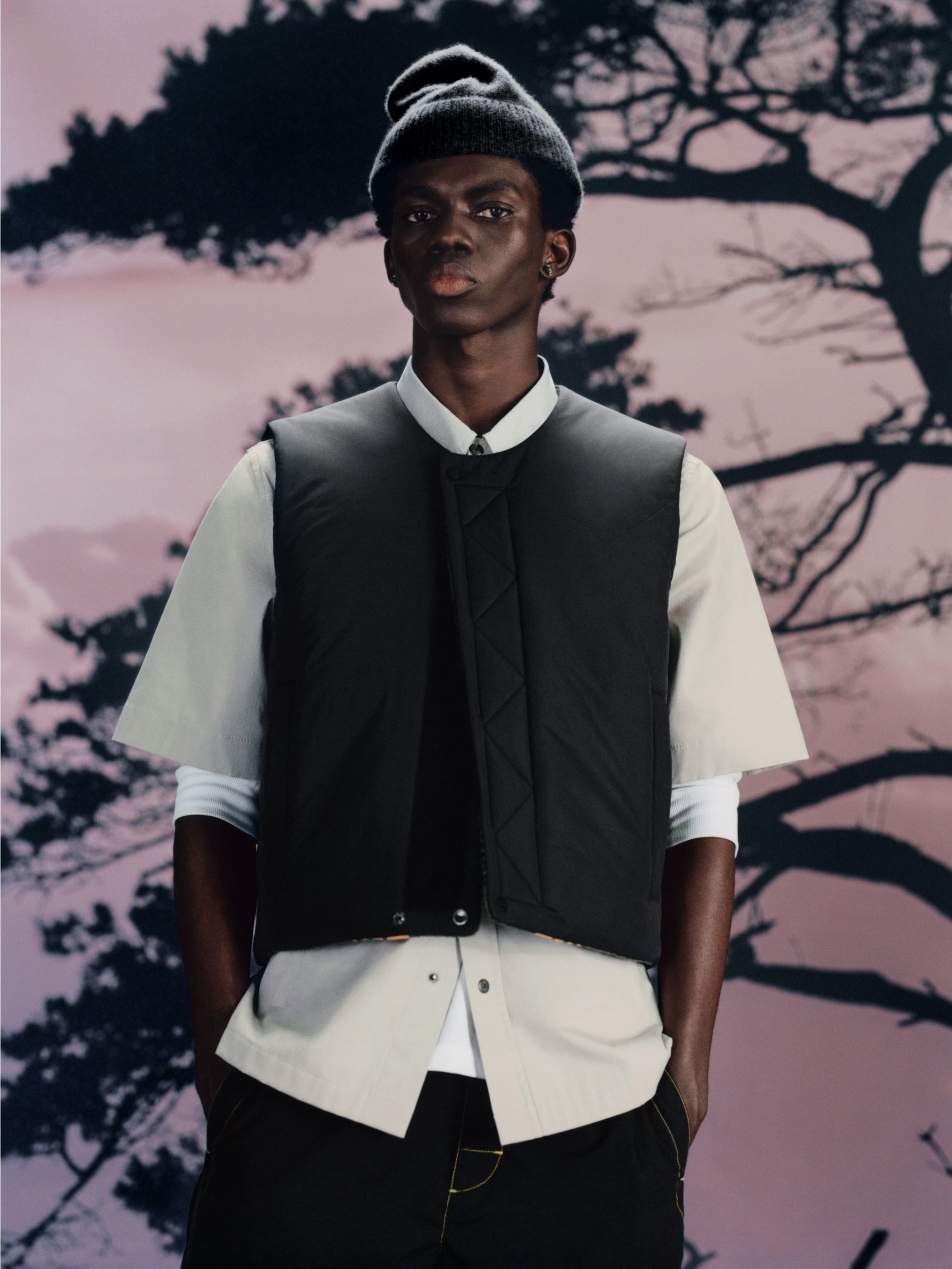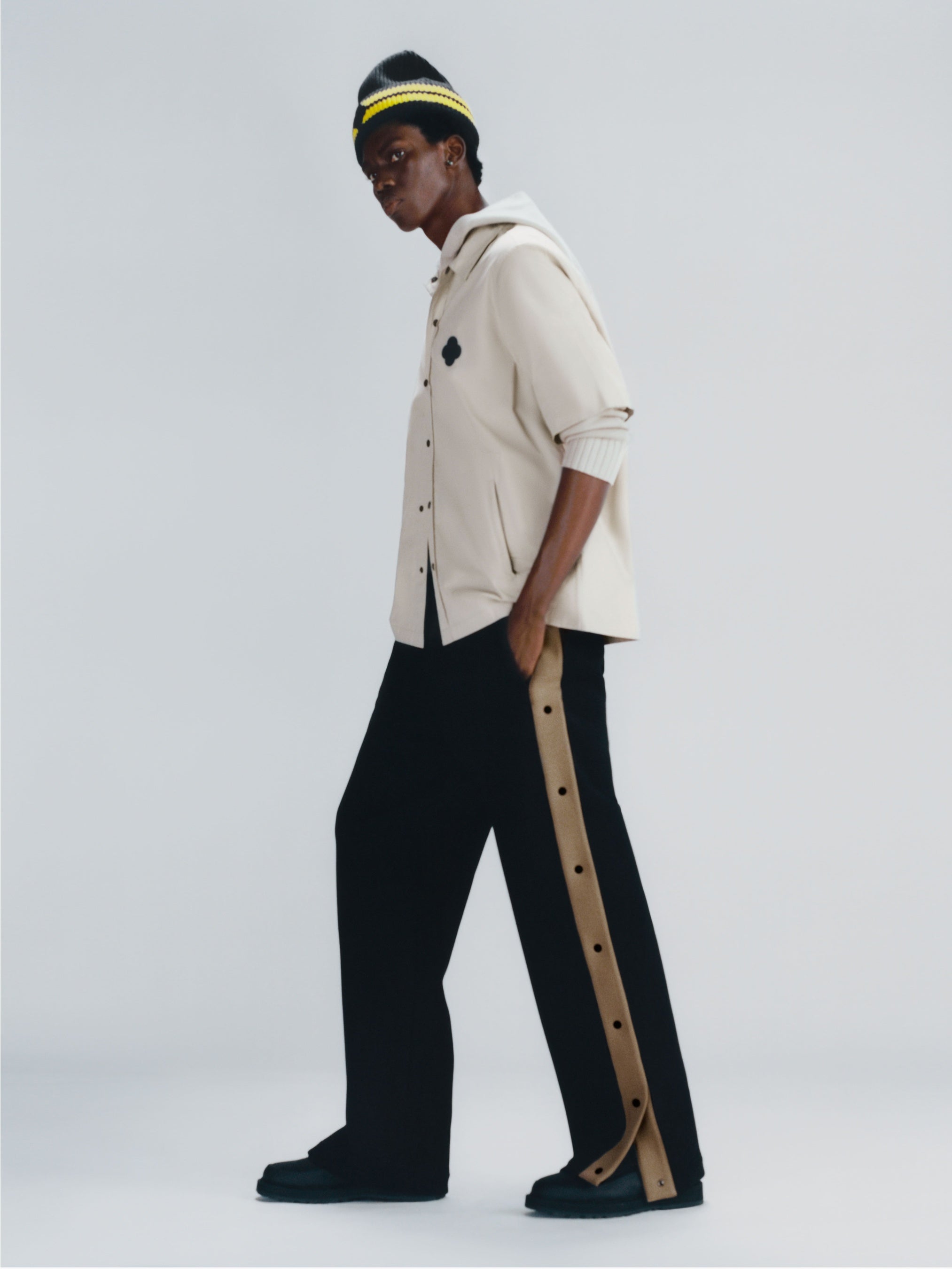デザインの工程においては、彼がこれまで歩んできた人生の複雑さを反映させ、いくつもの発見を盛り込みました。その結果、彼の過去と未来をブリッジするコレクションが誕生し、個々だけでなく社会全体にも語り掛けるものとなりました。メンズウェアにインスパイアされた40型以上のアイテムとユニセックスで展開するアクセサリーで構成される本コレクションでは、試行錯誤を繰り返しながら、小さなディテールが最終的にはデザインに大きな影響を及ぼすようなバタフライ効果も用いられています。スタイリングの幅を広げるリバーシブル仕様のダウンベストやオリジナルロゴがデザインされたハードウェアがアクセントのダウンジャケット、特別な日を彩るバタフライプリントのセットアップなど、トレンドに左右されることのない、個性と表現力を追求したコレクションが完成しました。