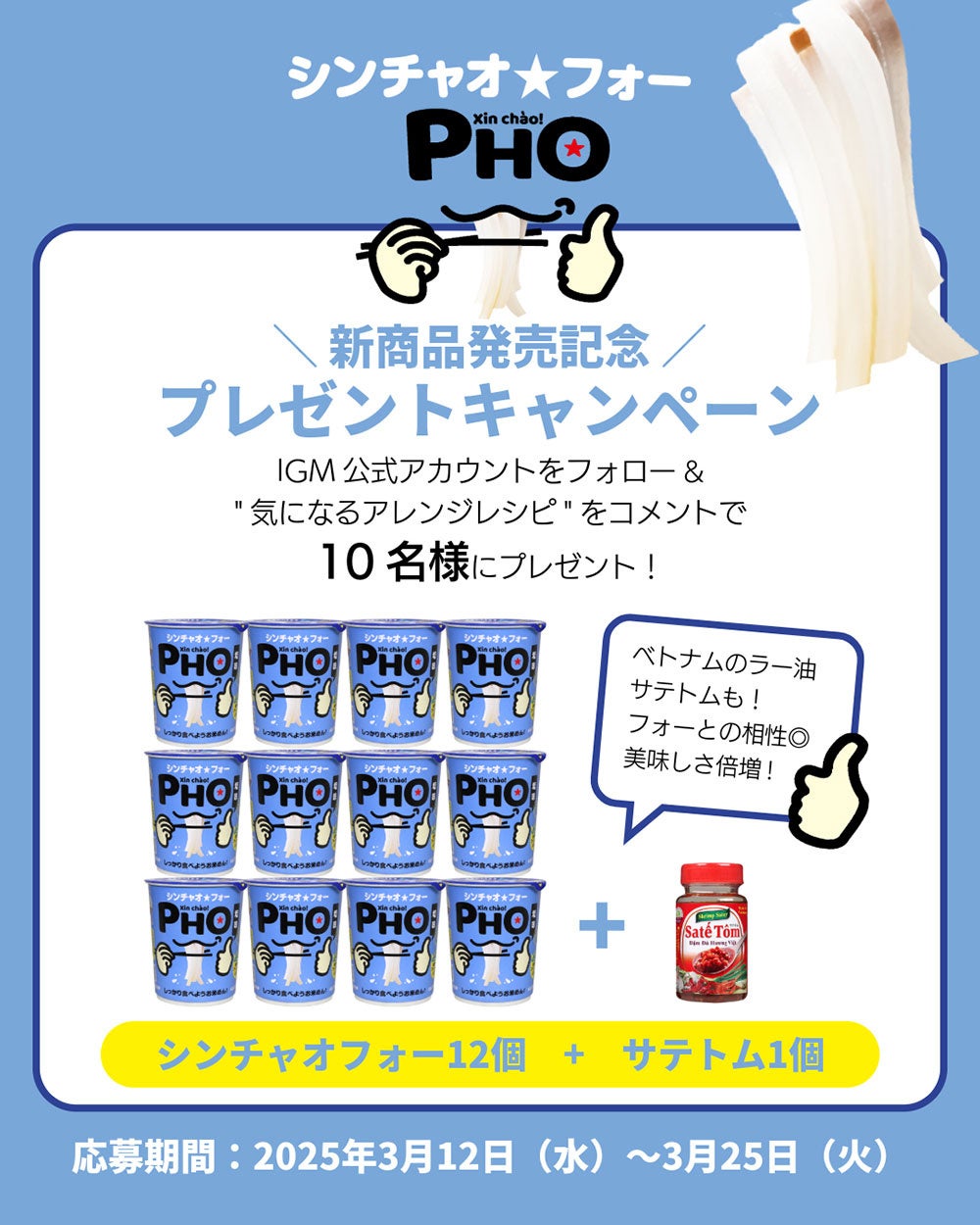 キャンペーン投稿に、“気になるアレンジレシピ”をコメント&アカウントフォローで、10名様に「しっかり食べよう シンチャオ★フォー」12個とアレンジ用のベトナムのエビ入りラー油「サテトム」をセットでプレゼント!ぜひご応募ください。