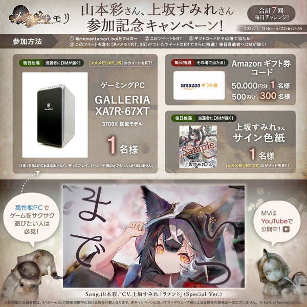◯応募方法:メメントモリ公式Twitterアカウント(@mementomori_boi)をフォローし、「#メメモリRT_35」がついた公式ツイートをリツイートすると、抽選で合計303名様に、上坂すみれさんのサイン入り色紙、Amazonギフト券コード、ゲーミングPCが当たります。