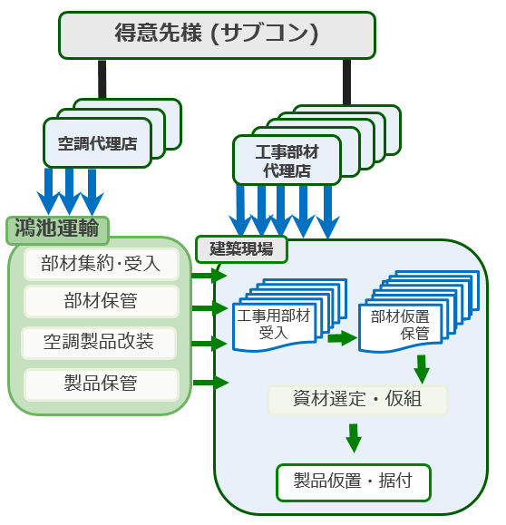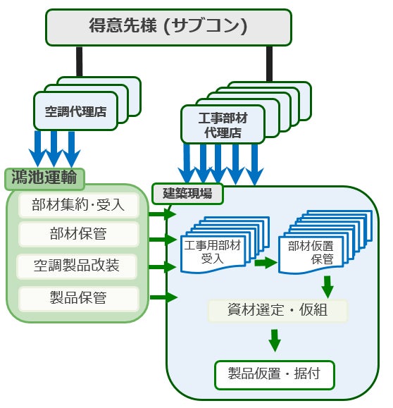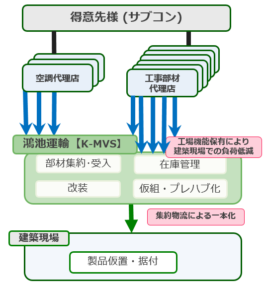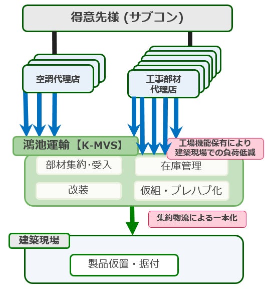 空調機メーカーが、業務用空調機をオフィスビルや商業施設等に施⼯する場合は、サブコンが各ベンダーと連絡を取りながら、空調機本体、配管、配線等の部材を調達、工事現場で組み立てながら据え付けるのが⼀般的です。しかし、この⽅法では、現場で空調機の配管や配線工事が必要なことに加え、部材の余剰在庫や保管場所確保、納品車両待機時間によるドライバーの負担やCO2排出量増加、各種煩雑な手配業務の発生等さまざまな課題があります。これらの課題を一挙に解決するサービスが、K-MVSです。K-MVSは、空調機据付に必要な配管・配線工事等すべてを鴻池運輸の拠点で一括して行い、工事現場に納品するサービスです。
