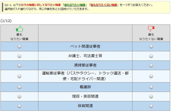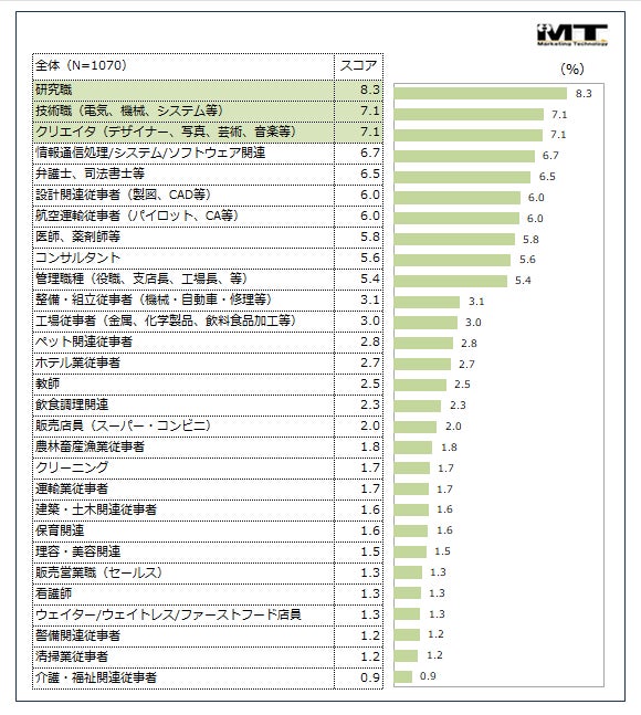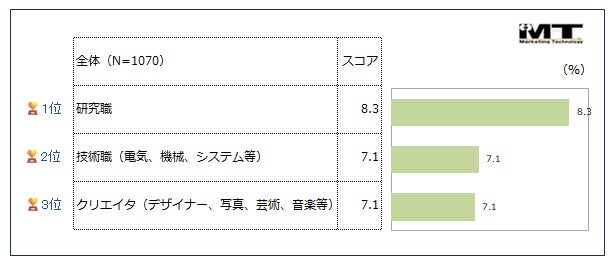 全体では 1位「研究職」 2位「技術職(電気、機械、システム等)」 3位「クリエイタ(デザイナー、写真、芸術、音楽等)」という結果になりました。