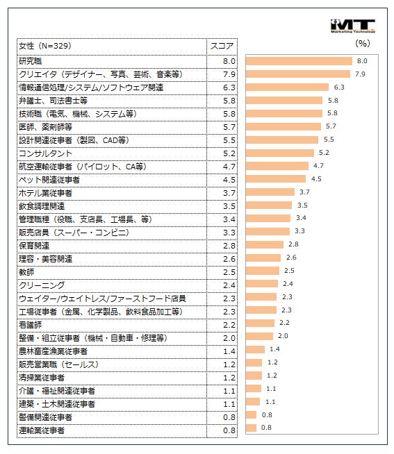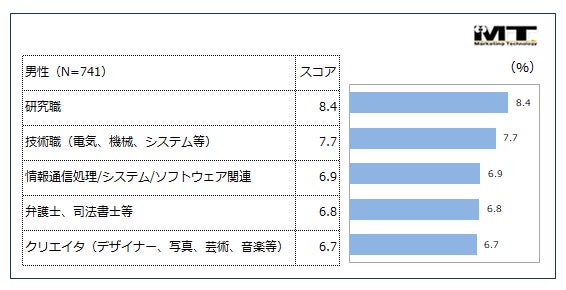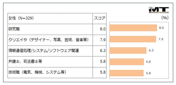 トップ5は男女ともに概ね全体と同様の傾向でしたが、女性では「クリエイタ(デザイナー、写真、芸術、音楽等)」が2位となり(約8%)、関心の高さが見受けられます。