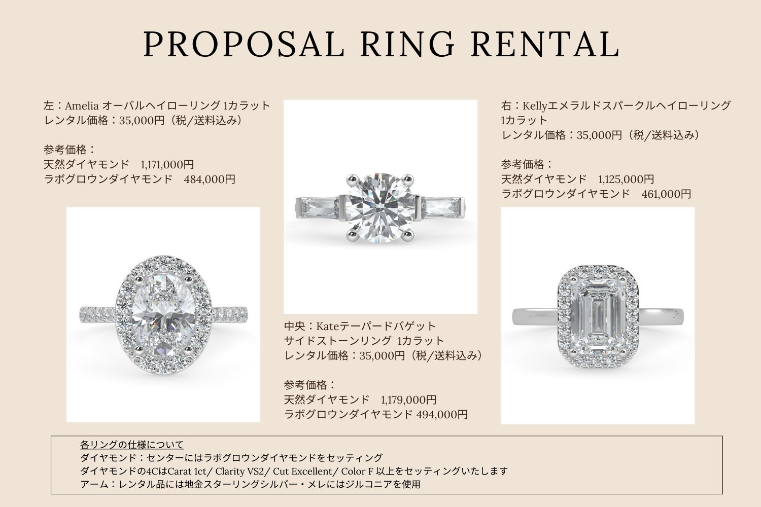 レンタルの対象はいずれも1カラットのラボグロウンダイヤモンドをセンターに使用したプロポーズにふさわしい華やかなリング。レンタル料金は7泊8日で税込35,000円(税・送料込み)です。また、プロポーズ後に当店の婚約指輪を気に入ってご購入いただく場合にお使いいただける同額のクーポンもおつけします。