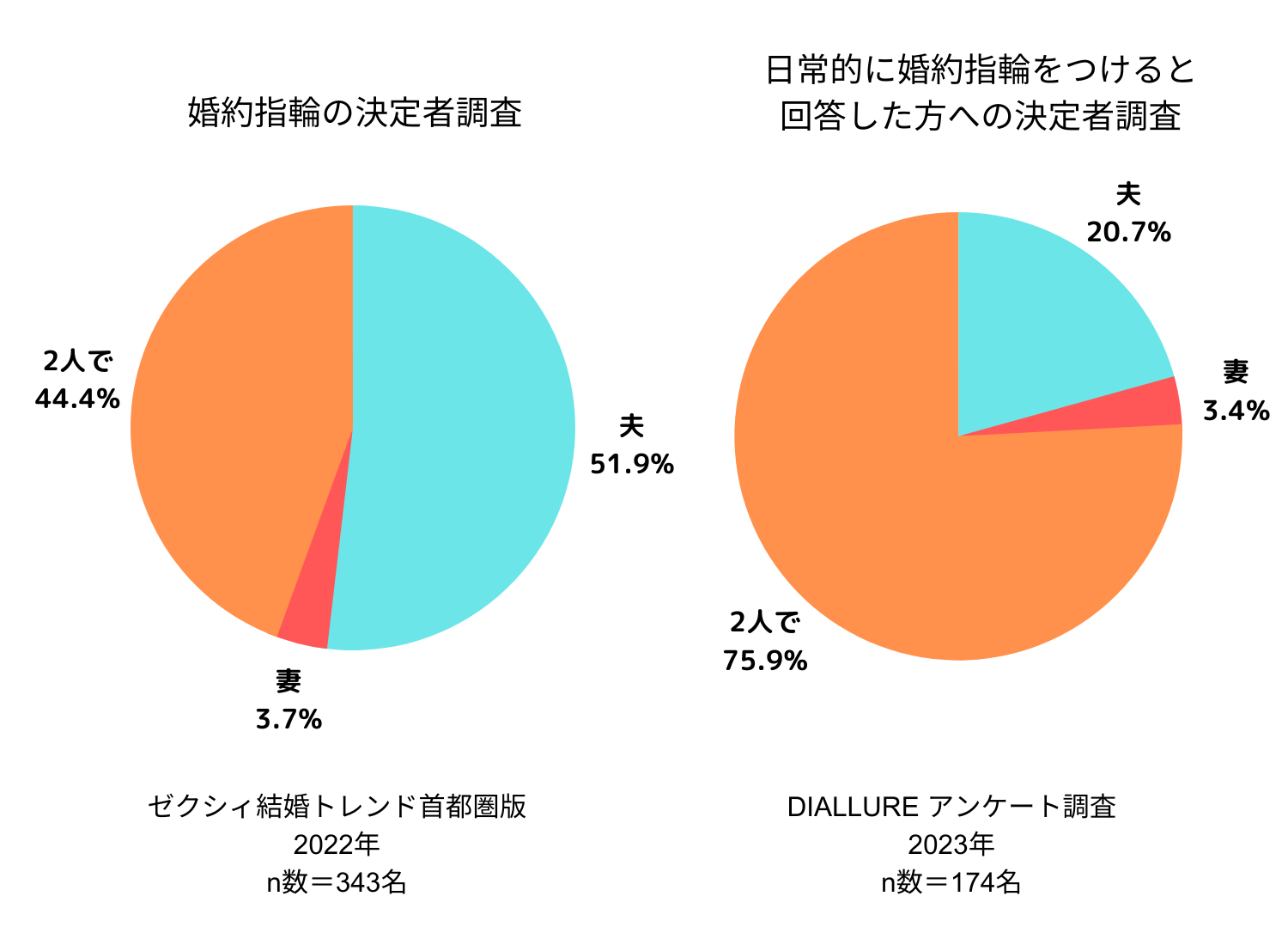 ゼクシィ結婚トレンド調査2022によると、婚約指輪を夫が決定したのは約半数。一方で、私たちのアンケート調査では「婚約指輪を普段からよく付ける」と回答した人の約8割がお二人または妻が指輪を選んでいます。つまり夫が一人で決定するよりも、決定プロセスに女性も関与したものこそが、長くご愛用いただける婚約指輪であるといえます。
