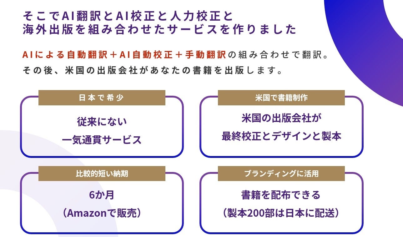 「あなたの書籍を英語にして北米で出版します」 日本の書籍を、従来より早く安く簡単に、海外へ翻訳出版。生成AI多言語化クラウドサービスにより今までの出版業界の課題を克服。