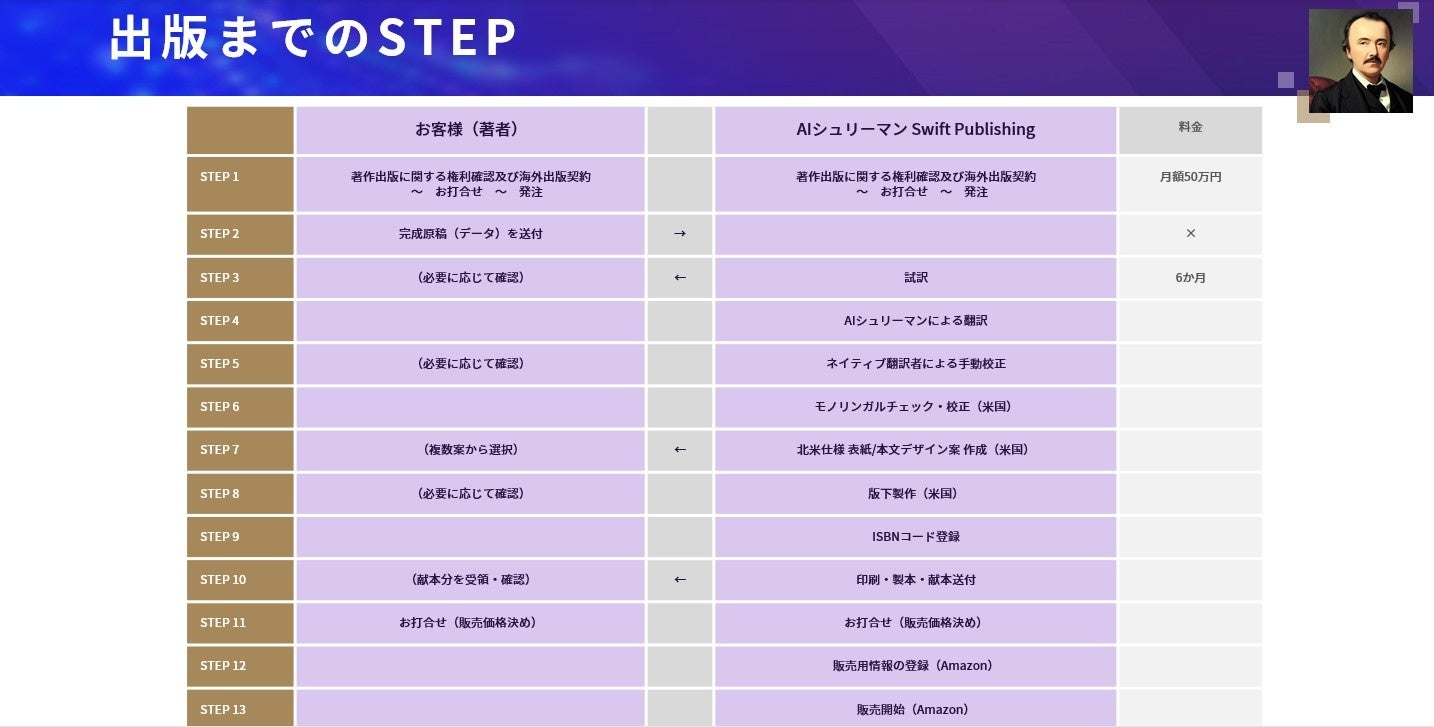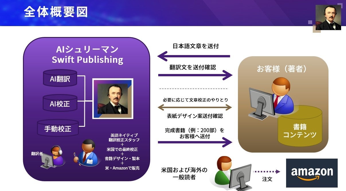 このような難しい状況を変えるため、生成AI多言語化クラウドサービスを提供するWIPジャパンは、日本語の書籍(主にビジネス書・実務書)を英語にして北米で出版する新たなサービス「AIシュリーマン Swift Publishing(スイフトパブリッシング)」を開始します。AI技術を駆使した高効率翻訳と、北米で歴史のある出版会社・PCS Inc.との強固な連携により、日本の書籍の海外出版について新しい可能性を切り開きます。