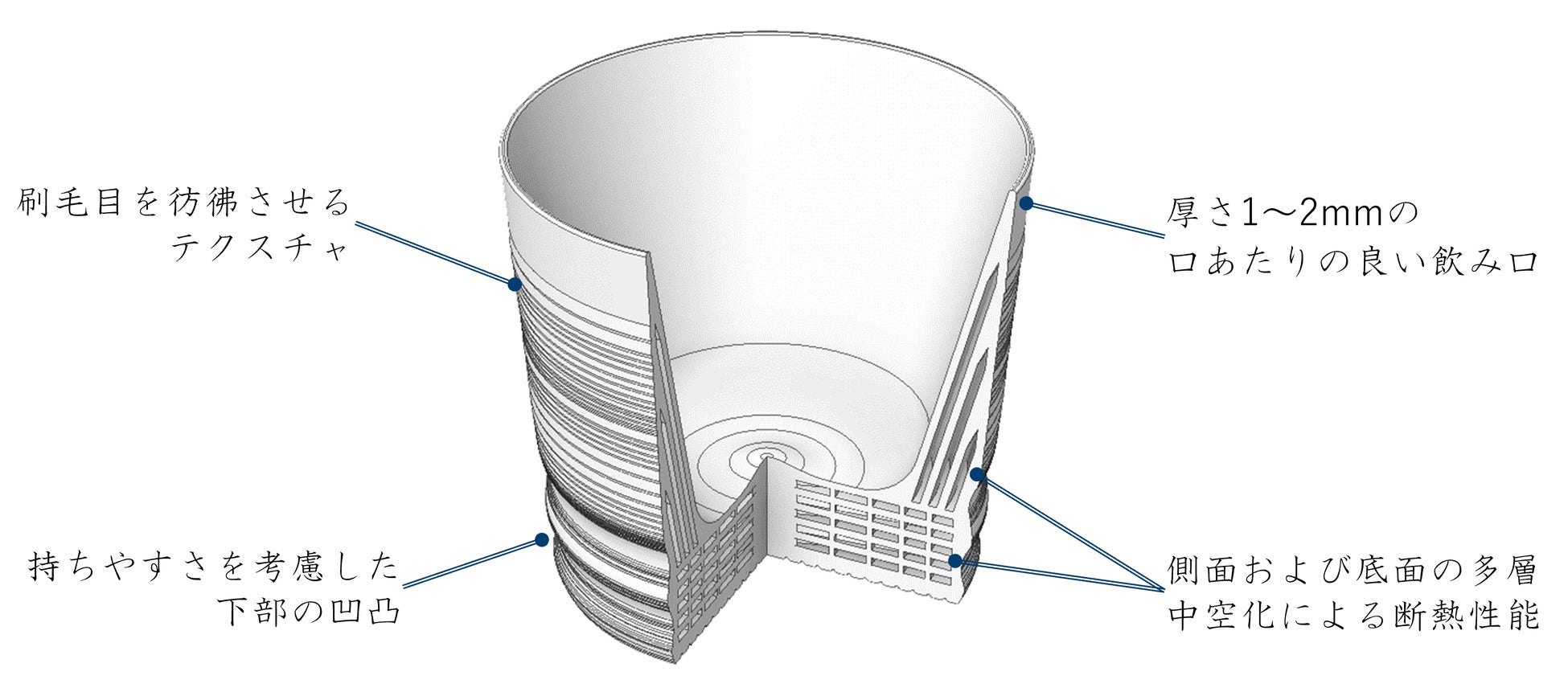 結露しにくく断熱性の高い内部構造と手にフィットする外側の凹凸形状、そこに漆の抗菌性をプラスしています。
