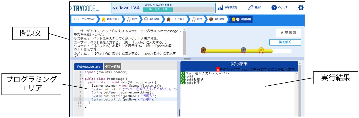 タイピング、プログラミングのやり方を身に着けるために、何度も反復で身に着け、概念や仕組みを理解する仕組みです。