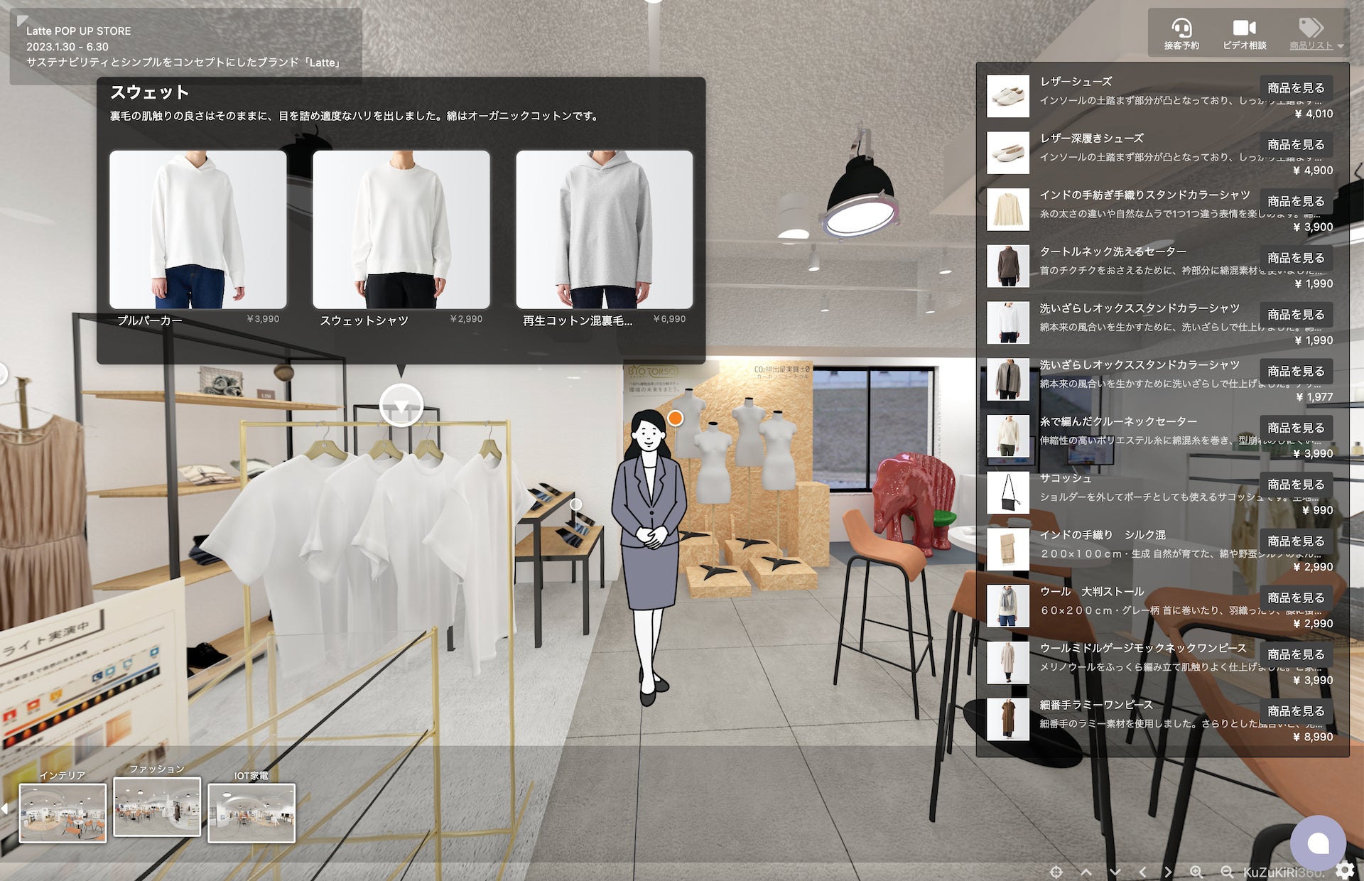 KuZuKiRi360は、業界をリードする360°VRコンテンツ制作・配信プラットフォームです。独自の技術を用いて、店舗や施設の空間を360°実写撮影し、実写バーチャル空間と360°CGによるバーチャル空間をユーザーに提供します。