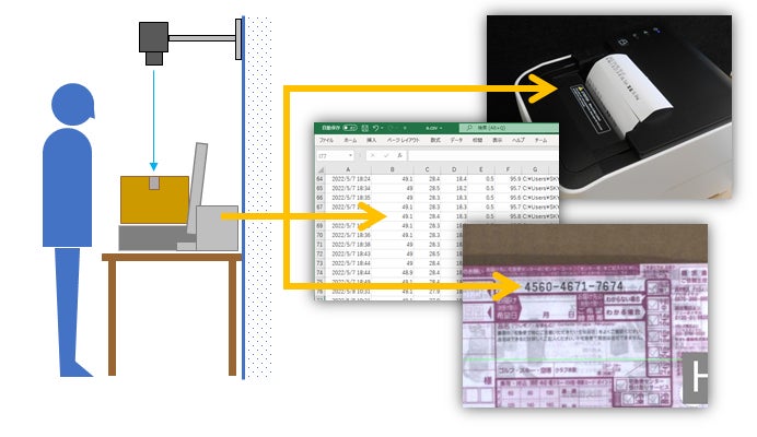 【BoxMetrixの使い方】カメラを上方に取り付け、カメラの真下に重量計を置きます。重量計の上に計測対象の箱を置くことによって重量計が重さを自動的に検知し、計測を実行します。計測データはCSVファイルや画像として保存されるほか、レシートプリンタに出力することができます。