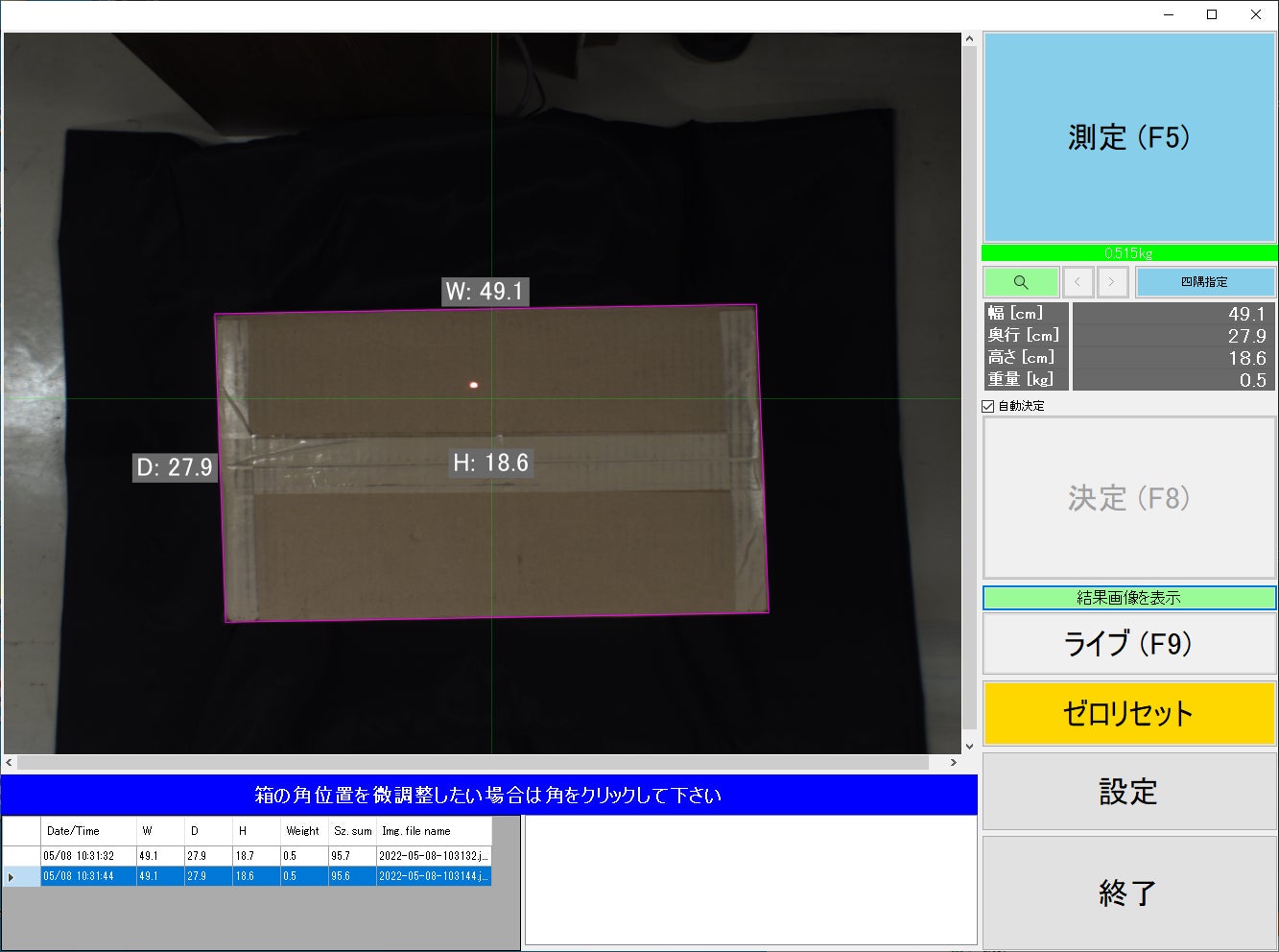 1. 箱を置いて2秒で幅・奥行・高さ・重量の値を出力。読取り間違いや転記ミスが発生しません。