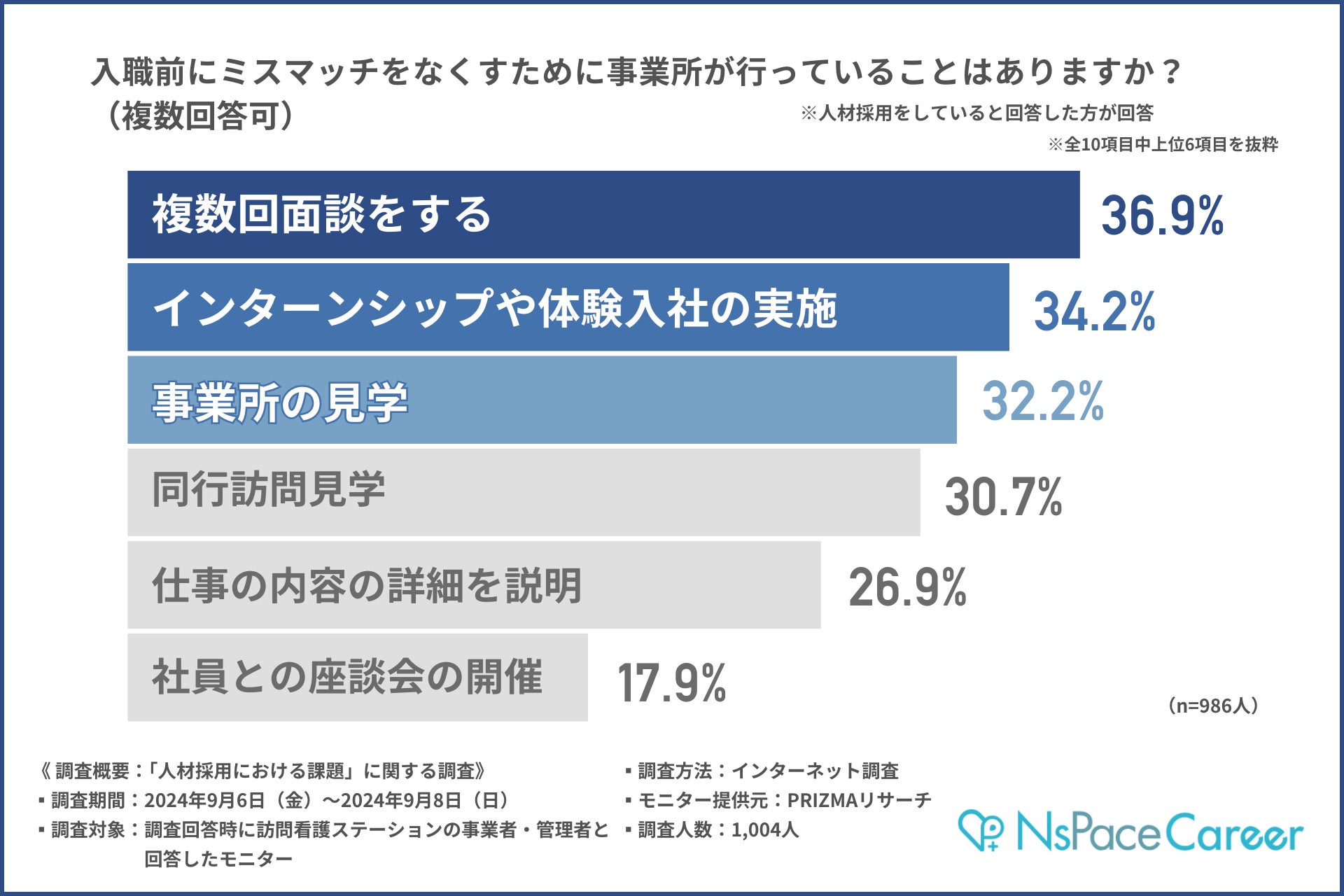 ・入職前のミスマッチをなくすため、「複数回面談をする(36.9%)」事業所が最も多いことが明らかになりました。