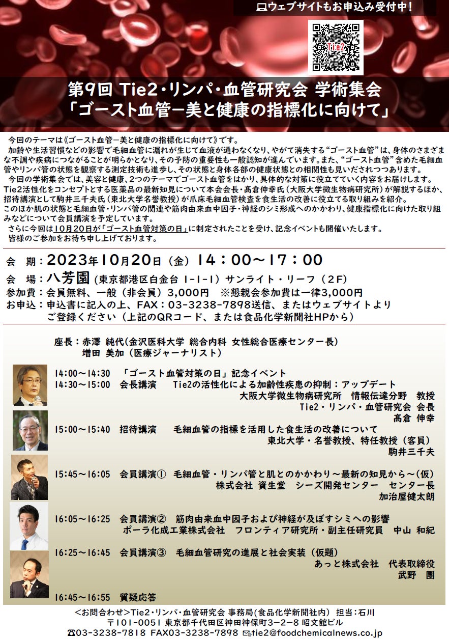 2023年10月20日(金)には記念日登録を記念して、八芳園(東京都港区白金台1-1-1)にて記念日登録証授与式とTie2・リンパ・血管研究会第9回学術集会を開催します。