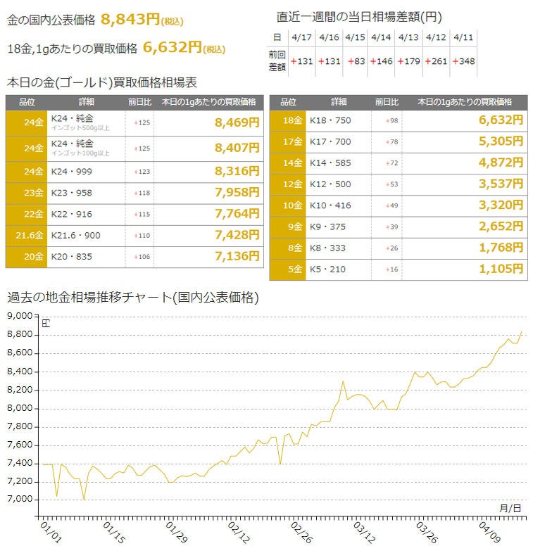 4月18日に『国内公表価格 8,843円/1g』を記録