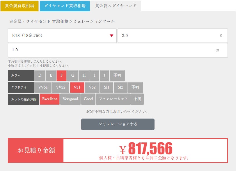 ウェブサイトには貴金属・ダイヤモンドの価格を品位や金性ごとにシミュレーション出来るツールをご用意。
