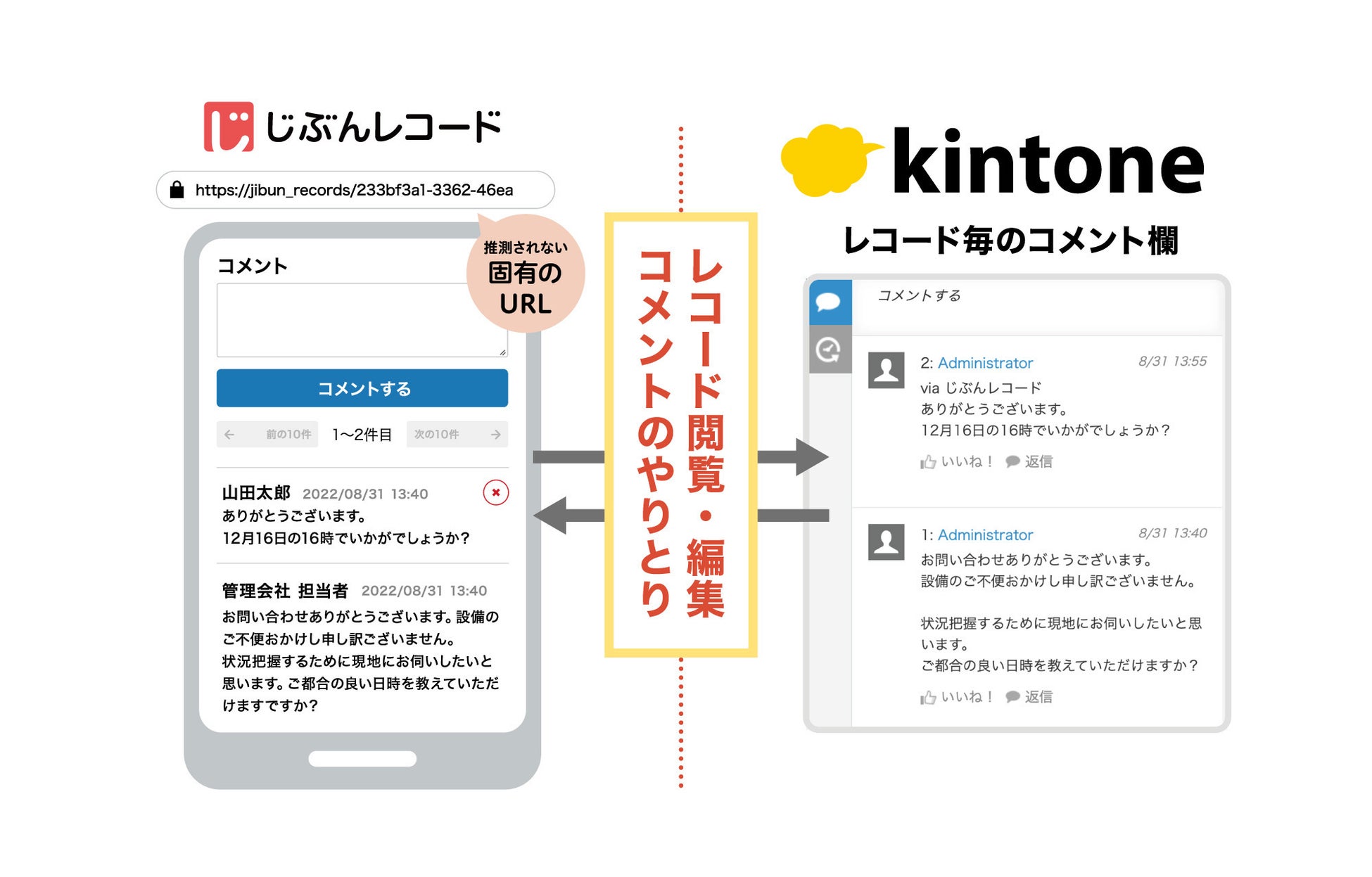 じぶんレコードから生成されたURLを共有すれば、kintoneアカウントがなくてもレコード情報にアクセスできます。(閲覧・編集・コメント・ファイル添付可能)URLにパスワードや公開終了日時の設定ができますので、セキュリティ面も安心です。