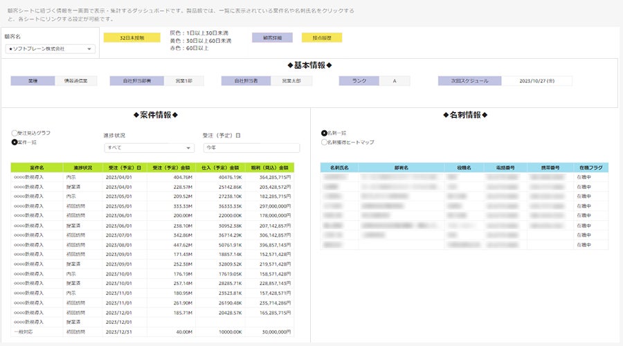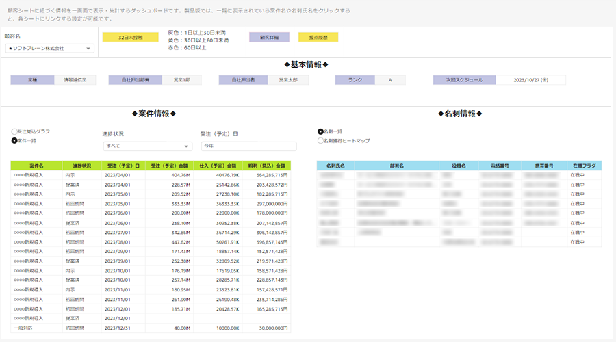 顧客カルテダッシュボードでは、顧客に関連するあらゆる情報(名刺、案件、活動、スケジュールなど)を集約し、一つの画面に表示します。