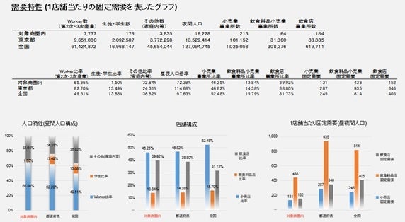 具体的には、店舗物件候補選定時点において【1】調査対象エリア0.5キロメートル圏内における小売業のデータを活用し、様々な業種や近隣商業地区における年間販売額と売り場面積、事業所数と月商、また、販売効率額等を比較結果として導き出し【2】昼夜間の人口構成比や店舗構成比を基に1店舗当たりの固定需要を予測【3】世帯年収における年間消費額を通じて将来的な商圏需要特性を予測したうえで【4】商業用不動産における現場のノウハウに長けた当社独自の鮮度の高いテナント毎の賃料データを加味して分析します。以上4つのステップにより、効果的かつ実効性の高い新規出店戦略の立案がスピーディーに可能となります。