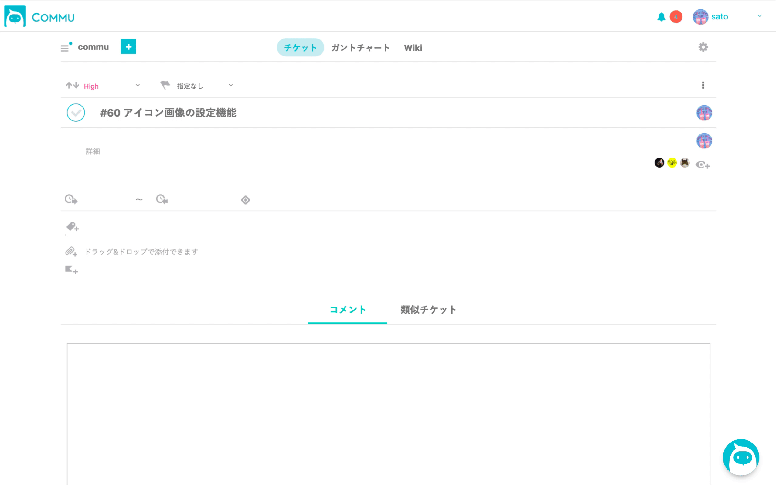 | ・チケット タスクをチケット化して適切にスケジュール管理 ・ガントチャート チケットをガントチャート形式で可視化 ・Wiki チームのナレッジをWikiで管理 ・チャットボット その日のタスクや期限の近いチケットなどを通知し、プロジェクトをサポート ・マルチプロジェクト 複数プロジェクトをCommuで管理 ・Markdown チケット詳細・コメント・WikiでMarkdown記法に対応 |