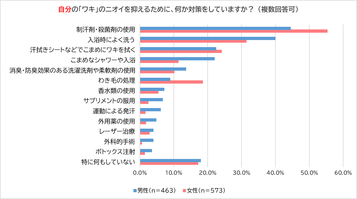 続いて、「自分のワキのニオイを抑えるために、何か対策をしているのか?」聞きました。男女共に「制汗剤・殺菌剤の使用」(男性:44.5%、女性:55.3%)が最多で、以下「入浴時によく洗う」(男性:40.0%、女性:31.4%)、「汗拭きシートなどでこまめにワキを拭く」(男性:22.5%、女性:24.1%)となりました。また、「外用剤の使用」「レーザー治療」「外科的手術」「ボトックス注射」などを行っている人は男女共にどれも5.0%未満と少なく、ニオイは気になるにものの、病院やクリニックなどでの治療を行っていない人が多くいることもわかりました。