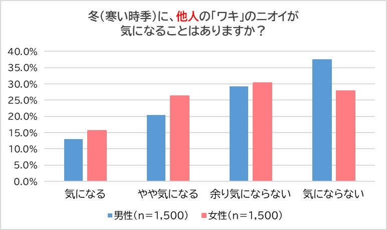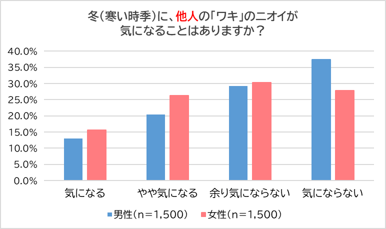 【3,000人に調査】冬でも気になる自分・他人の「ワキ」のニオイ 女性の約4割「自分のワキのニオイが気になる」! 「ニオイ対策していない」男女共に2割弱