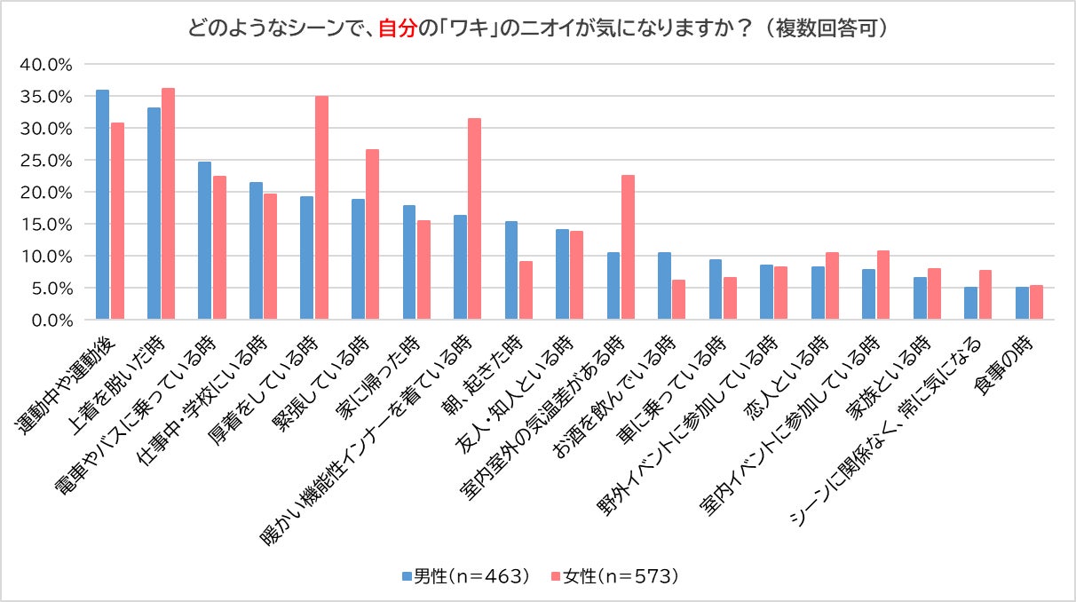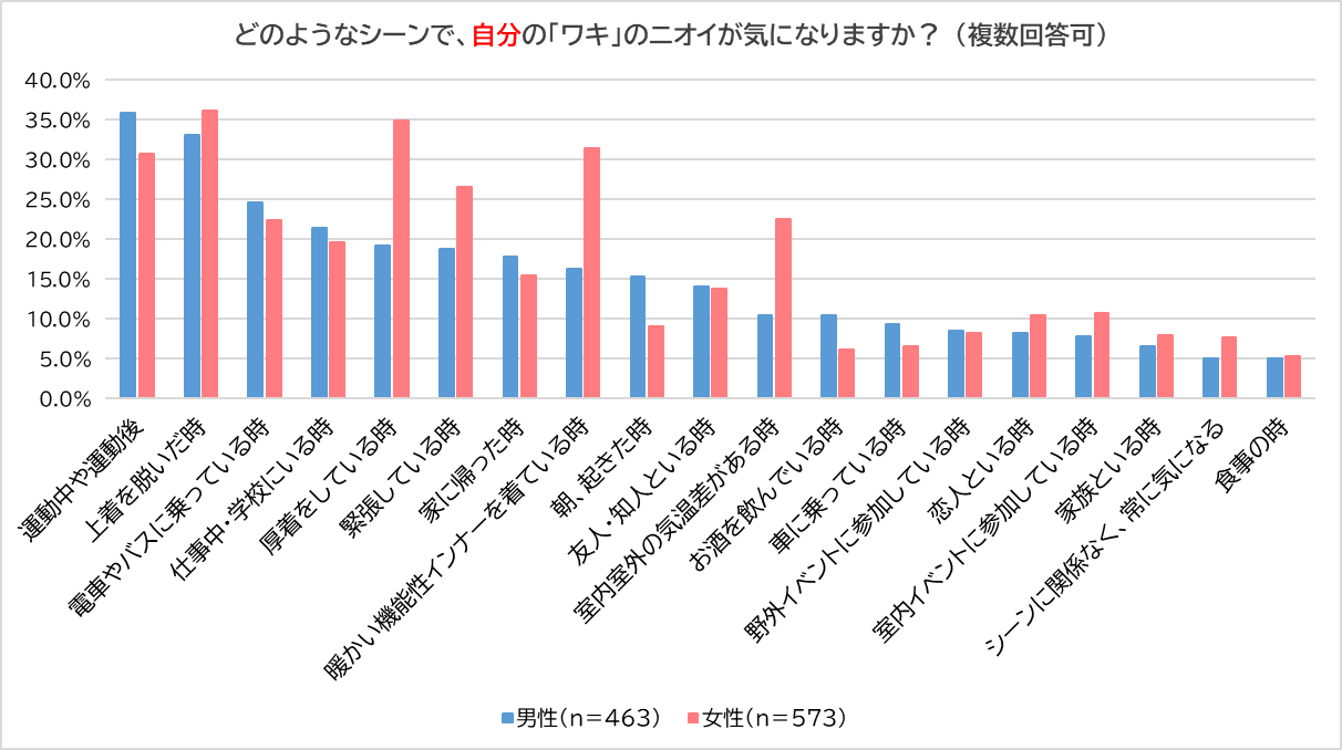 「気になる」「やや気になる」と回答した1,036人に、「どのようなシーンで、自分のワキのニオイが気になるのか?」聞きました。男女共に多かったのは「運動中や運動後」(男性:35.9%、女性:30.7%)、「上着を脱いだ時」(男性:33.0%、女性:36.1%)。一方、「厚着をしている時」(男性:19.2%、女性:34.9%)、「暖かい機能性インナーを着ている時」(男性:16.2%、女性:31.4%)、「室内室外の気温差がある時」(男性:10.4%、女性:22.5%)は、男性よりも女性の方が12ポイント以上多い結果となりました。