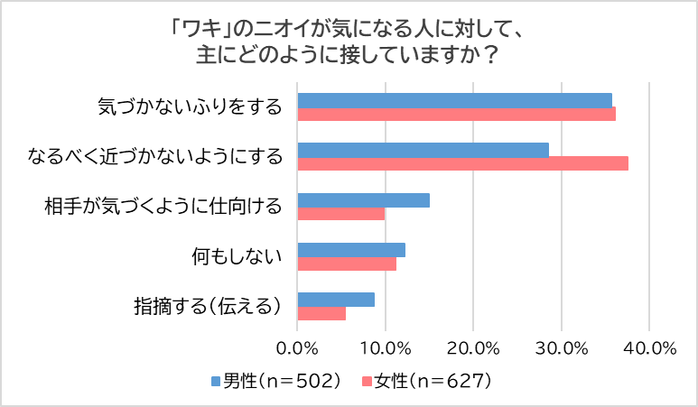 「気なる」「やや気になる」と回答した1,129人に、「ワキのニオイが気になる人に対して、主にどのように接しているか?」聞きました。男性では「気づかないふりをする」(男性:35.7%、女性:36.0%)、女性では「なるべく近づかないようにする」(男性:28.5%、女性:37.5%)が最多となり、「指摘する(伝える)」(男性:8.8%、女性:5.4%)はわずかしかいませんでした。