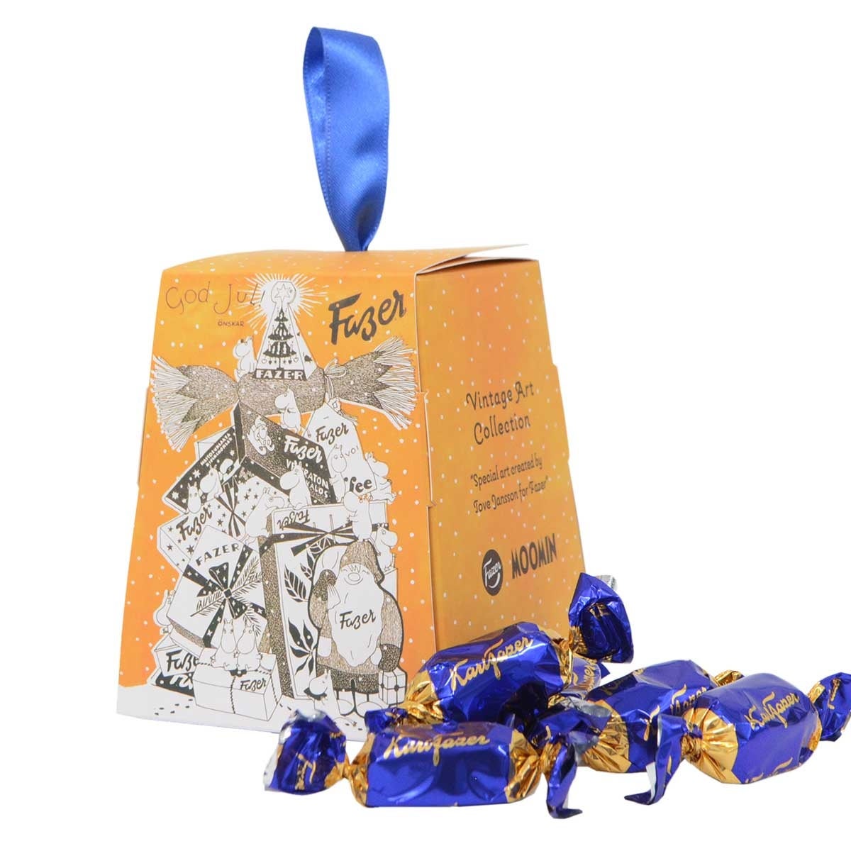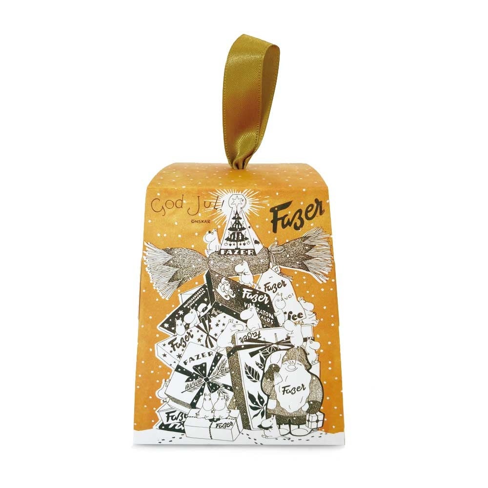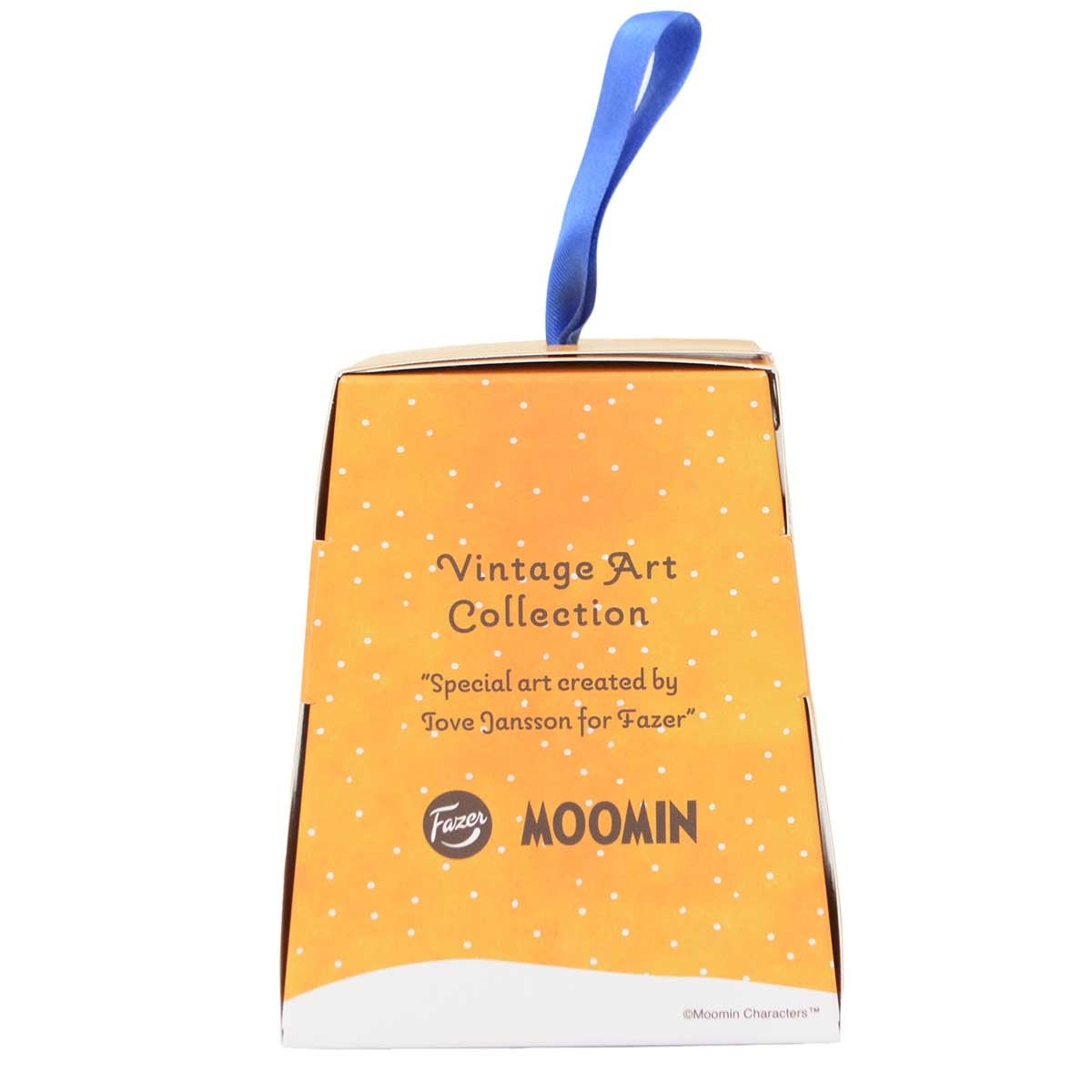 本商品のパッケージに使用されているアートは、ムーミンの作者であるトーベ・ヤンソンによって1951年のクリスマス広告用に描かれたものです。クリスマスツリーのように見立てたファッツェルの製品であるチョコレートやギフトボックスで構成されています。ムーミンの物語には出てこないサンタクロースとムーミンが共演する大変貴重なデザインです。このアートが商品や広告等に使用されることは滅多にありません。2004年にファッツェルがARABIA社に限定400個で生産依頼したマグカップは発売後、コレクターの間で争奪戦になり、瞬く間に世界で最も市場価格が高いムーミンマグカップとなりました。