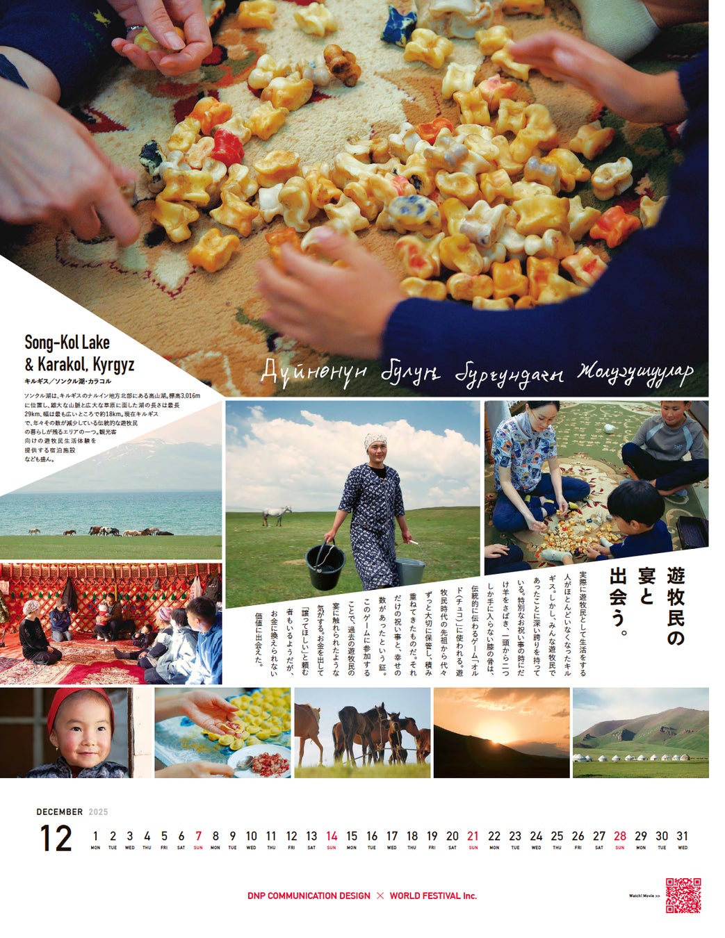 2025年カレンダー『世界のすみずみと出会う』は、WORLD FESTIVAL がこれまで訪れたさまざまな国や地域で撮影した映像や写真素材と、現地での出会いやストーリーをもとに、厳選した1月〜12月までの毎月異なる国を巡り、現地の日常や暮らしのなかにある固有の美しさとたくましさを発見していただくストーリーカレンダーです。