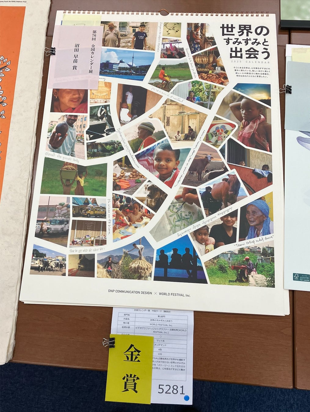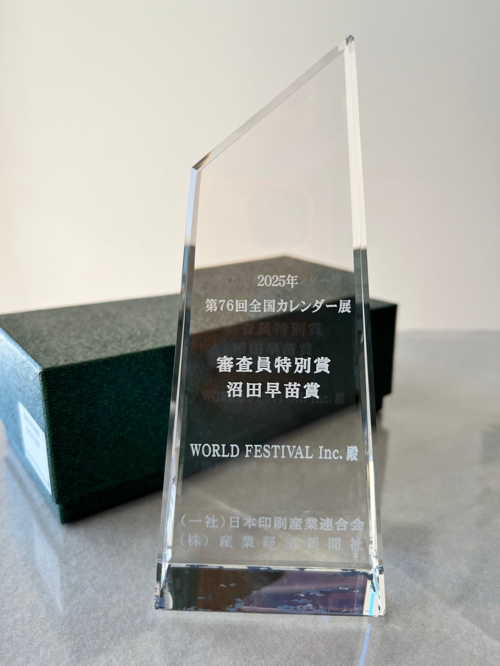 WORLD FESTIVAL Inc.(本社:東京都渋谷区、代表取締役:近藤 祐希)と大日本印刷株式会社のグループ会社である 株式会社DNPコミュニケーションデザイン(本社:東京都新宿区、代表取締役社長:久保田 哲)と制作した2025年カレンダー『世界のすみずみと出会う』が第76回全国カレンダー展(主催:一般社団法人日本印刷産業連合会・産経新聞社)の第1部門:BtoB向け企業カレンダー(企業・団体に配布するカレンダー)において「金賞」および「審査員特別賞(沼田早苗)」をダブル受賞しました。