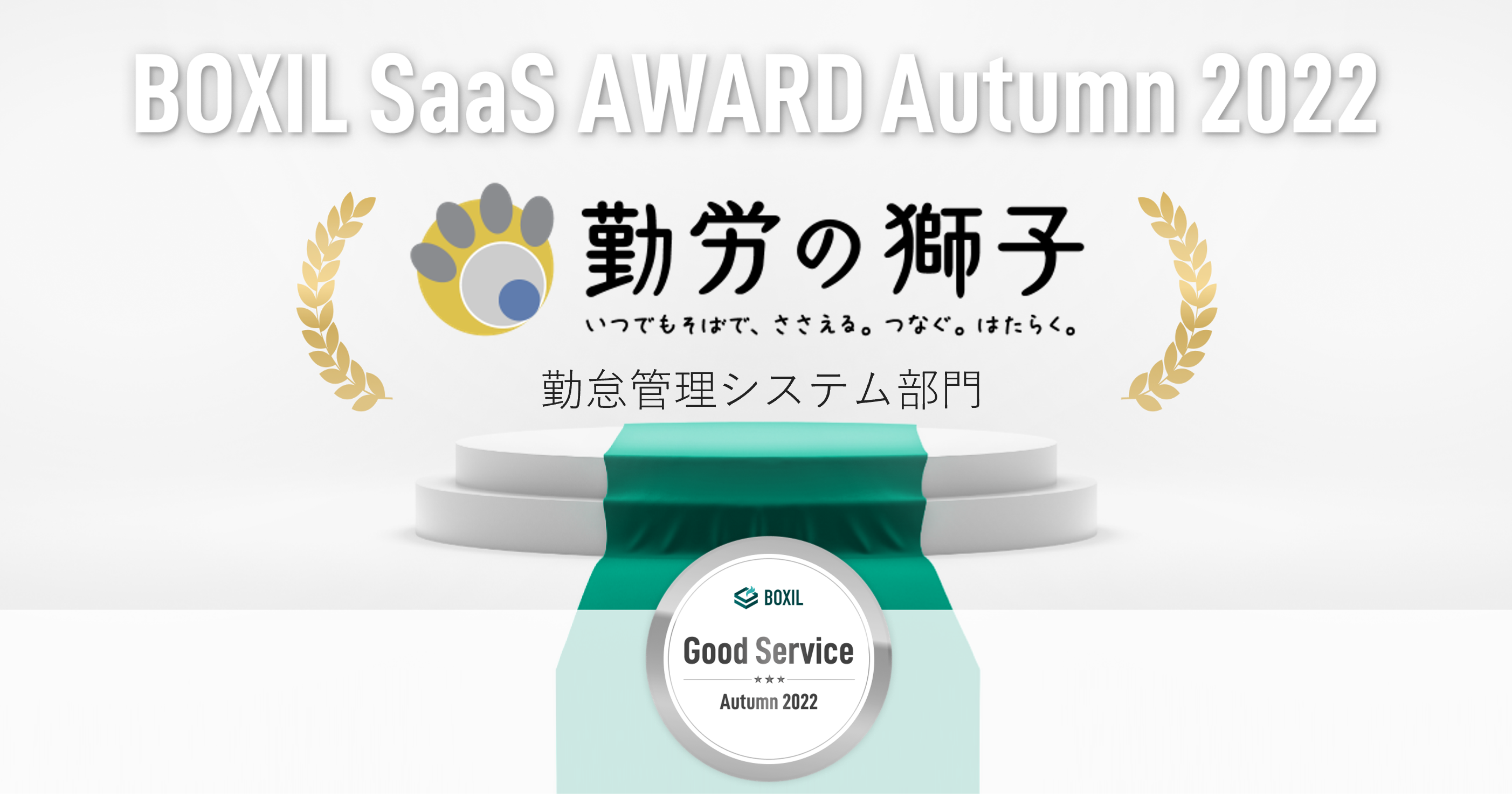 「BOXIL SaaS AWARD(ボクシル サース アワード)」は、スマートキャンプが運営するSaaS比較サイト「BOXIL SaaS」に掲載されている約3,000サービスの中から優れたSaaSを審査、選考、表彰するイベントです。今回の「BOXIL SaaS AWARD Autumn 2022」は、2021年7月1日から2022年6月30日までの1年間で新たに投稿された口コミ約6,500件を審査対象としており、「勤労の獅子」は「勤怠管理システム部門」で「Good Service」に選ばれました。また、その証となる「Good Serviceバッジ」が、スマートキャンプから付与されました。