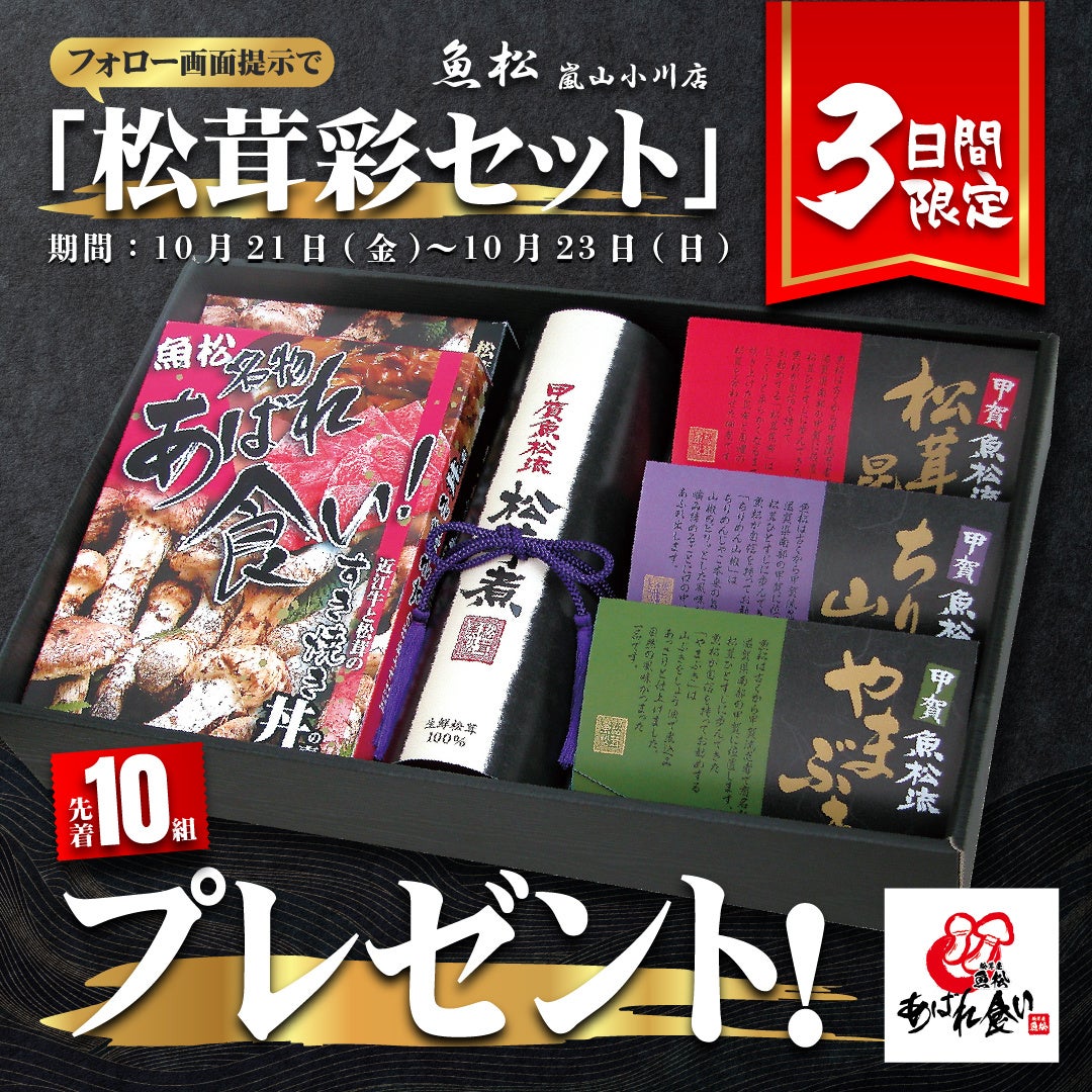 10月21日(金)〜23日(日)の3日間限定でフォロー画面を提示頂くと先着10組様に「松茸彩セット」をプレゼントいたします。(セット内容:甲賀魚松流 松茸煮・甲賀魚松流 松茸昆布・甲賀魚松流やまぶき・甲賀魚松流ちりめん山椒・近江牛松茸カレー・近江牛と松茸のすき焼き丼の素)