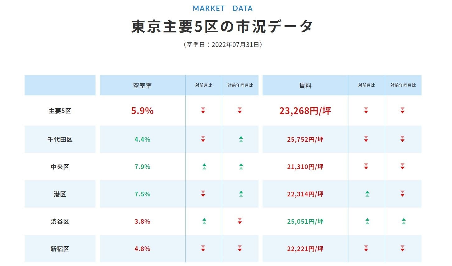 東京都内主要5区の『空室率』と『平均賃料』の最新データを毎月公表いたします。区ごとに、前月、前年同月と比較でき、オフィス市況の変動を把握できるようにいたしました。相場の把握、移転タイミング判断材料としてご活用下さい。毎月5営業日以内の業界最速発行の市況レポートを目指します。