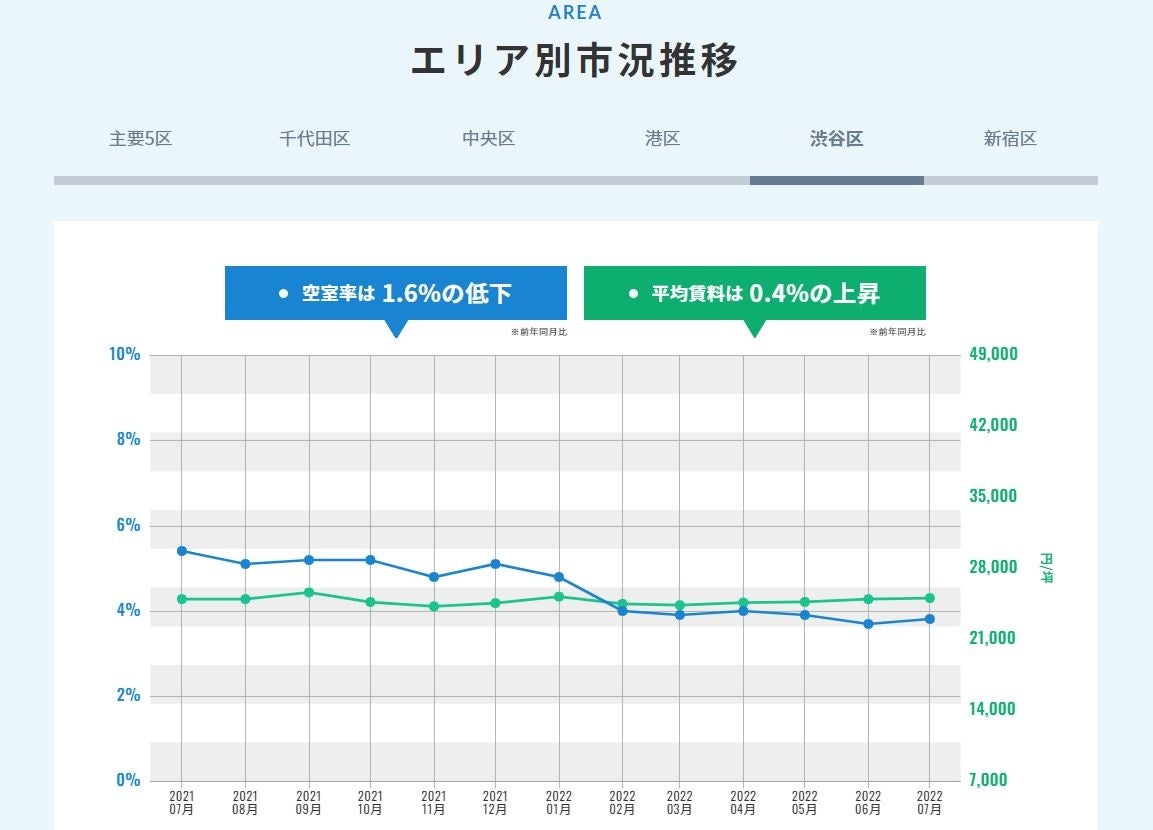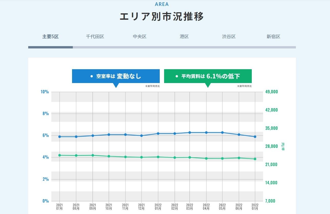 主要5区全体としては空室率は直近2年上昇トレンドではあるものの、2020年7月~2021年7月は3.8%上昇に対し、2021年7月~2022年7月は±0%となり、踊り場を迎えています。それに伴い、平均賃料も下げ止まりつつあります。