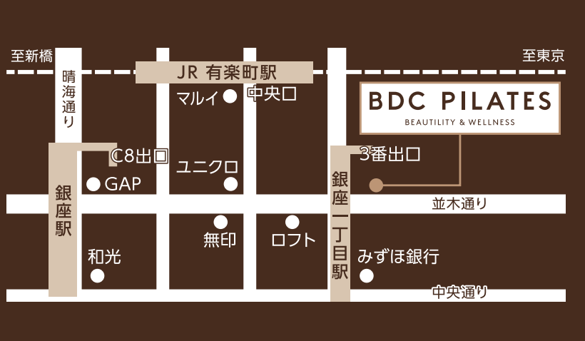 BDC PILATES銀座並木通り店は、銀座駅から4分、JR有楽町駅から3分、銀座一丁目駅から1分、と駅近でアクセス良好。