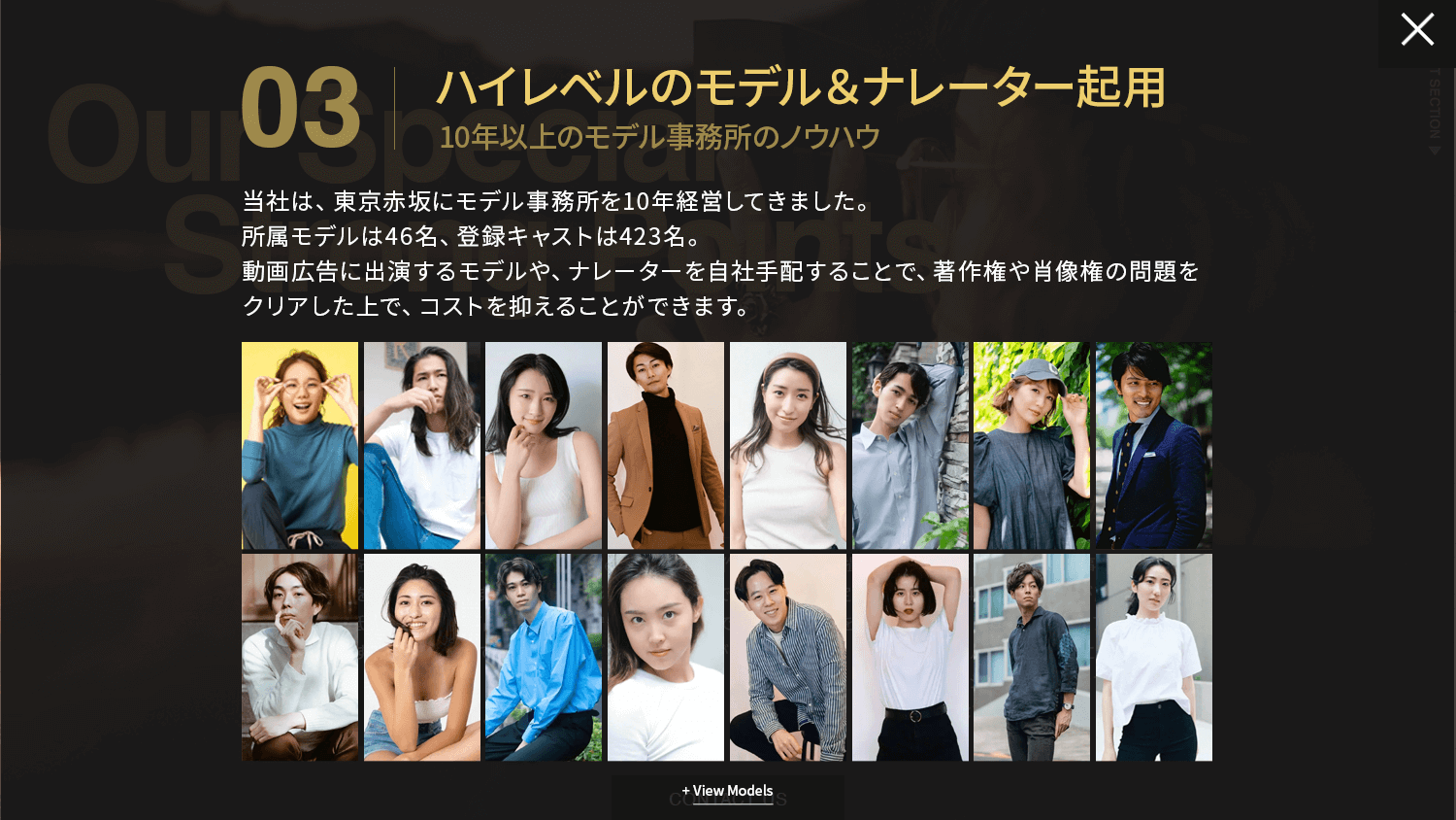 当社は東京赤坂にてモデル事務所を10年経営して来ました。所属モデルは51名、登録キャストは423名。(2022年1月時点)動画広告に出演するモデル・俳優、およびナレーターを自社で手配することで、著作権や肖像権の問題をクリアした上で、圧倒的にコストを抑える事ができます。