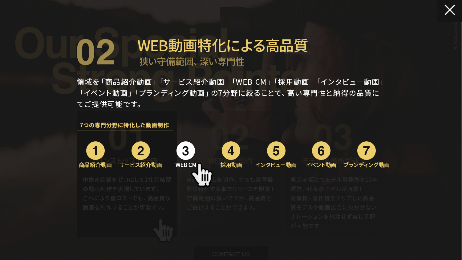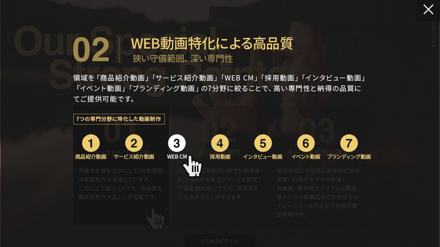 当社では予算規模の大きなTV-CMやドラマ、ドキュメンタリー、ライブ配信、全編アニメーション制作は行いません。得意なのは、商品紹介動画、サービス紹介動画、WebCM、採用動画、インタビュー動画、イベント動画、事業紹介や会社紹介を含めたブランディング動画です。web動画制作、特に実写撮影にリソースを限定する事で、守備範囲は狭くなります。しかし、高い品質を担保します。