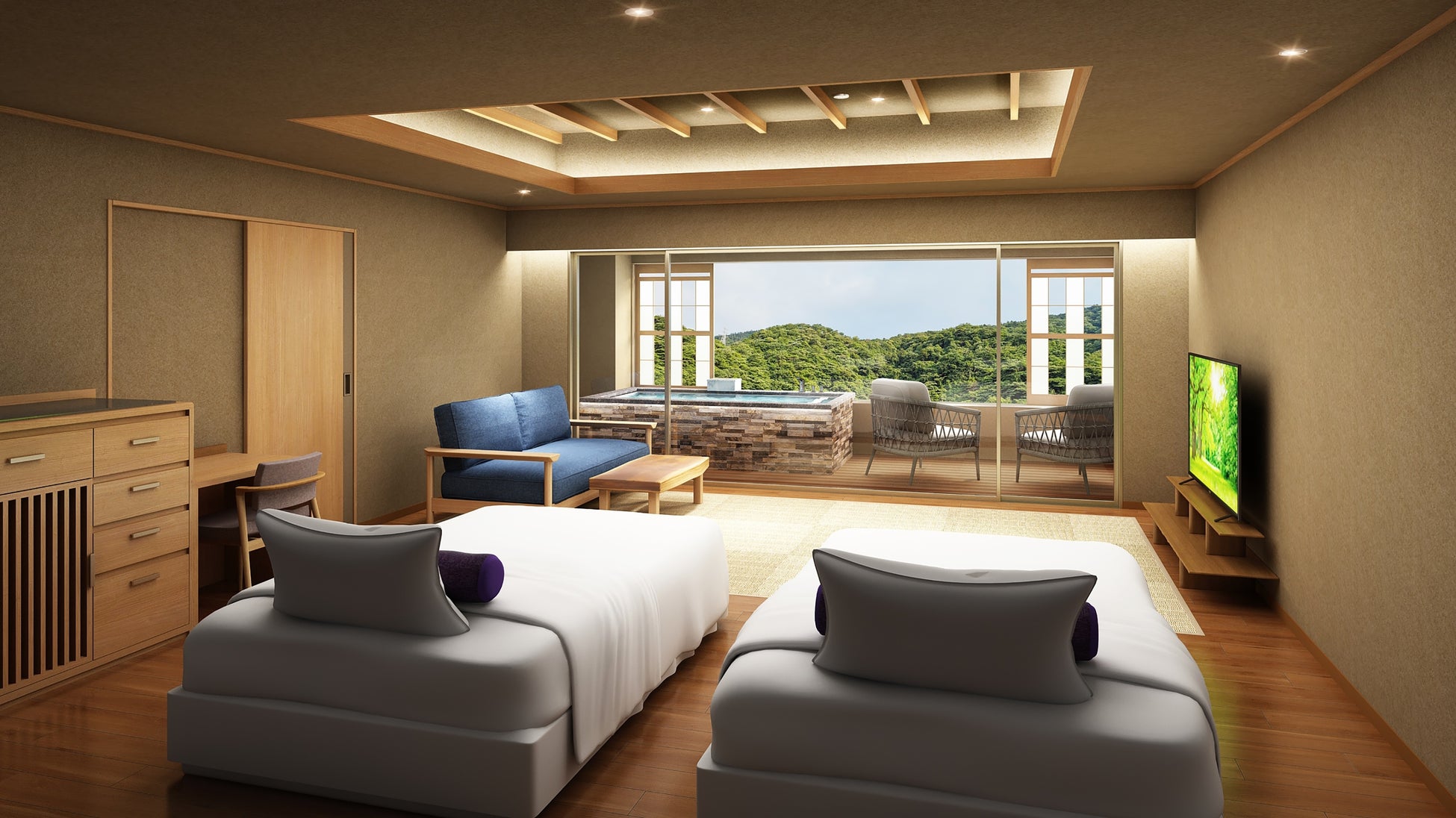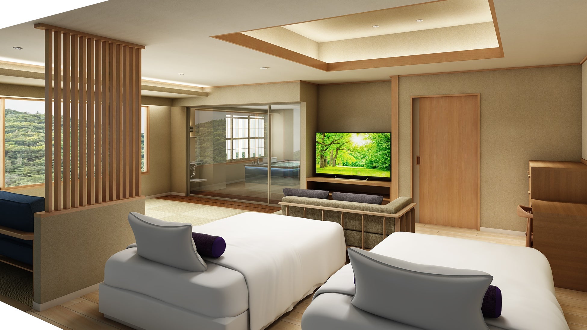 新客室「【最上階 露天風呂付き 雅~MIYABI~】和洋室 64平米」と、「【最上階 露天風呂付き 牡丹~BOTAN~】和洋室 76平米」の予約受付は、2024年8月1日より開始いたします。宿泊は2024年10月1日より可能となります。詳細やご予約は、公式サイトをご覧ください。