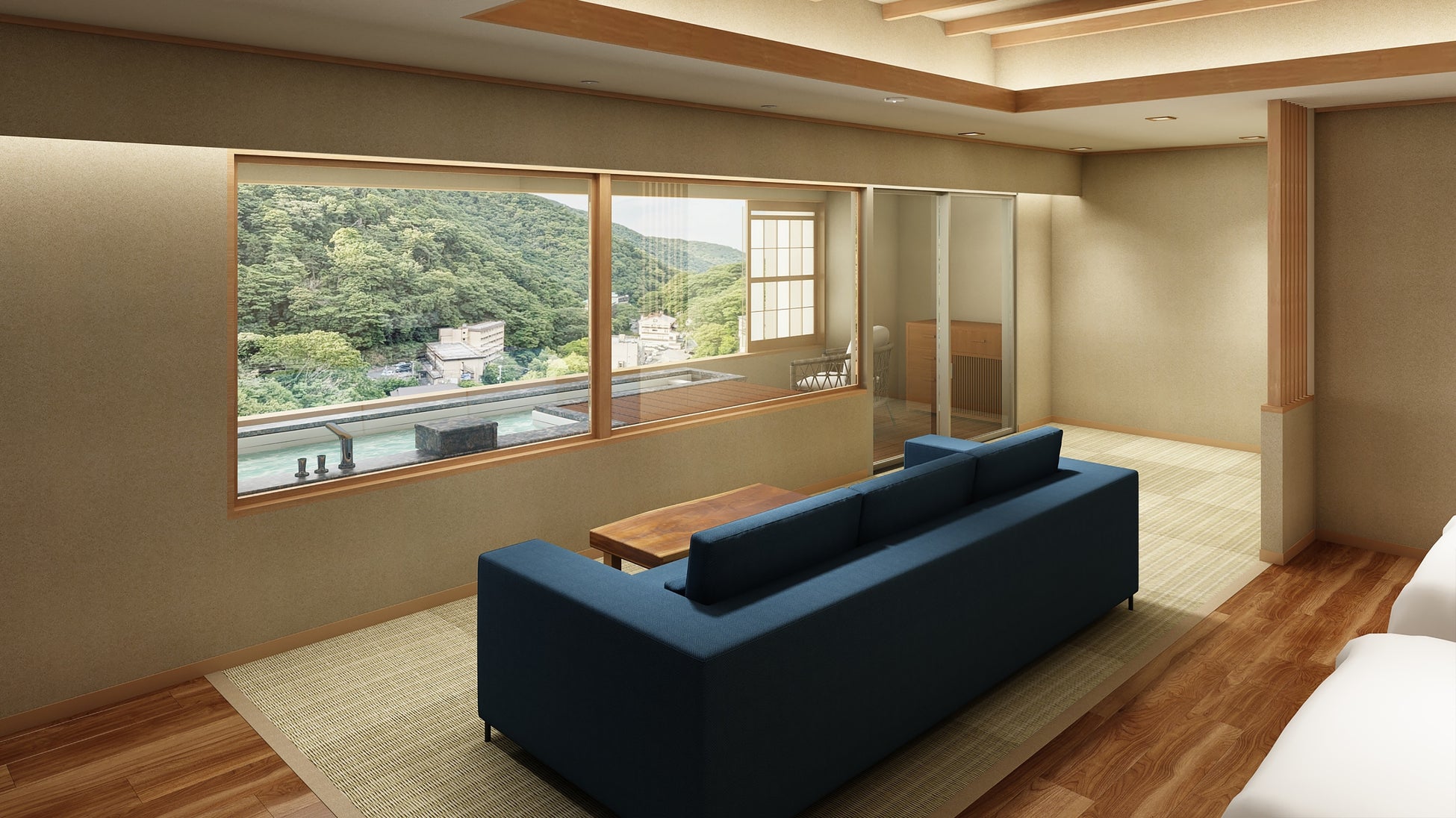 リニューアルした客室では、プライベートな空間で温泉を楽しみながら、雄大な自然の中でリラックスした時間をお過ごしいただけます。