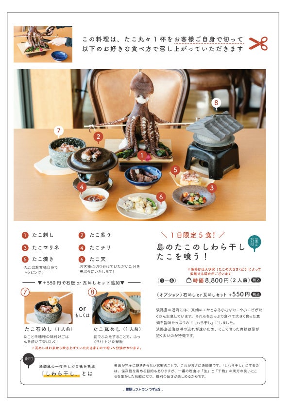 「島のたこのしわら干し たこを喰らう!」は、その足を好きな大きさに切っていただき、たこマリネ・たこ刺し・たこチリ・たこ焼き・たこ天・炙りたこ・たこ瓦めし(追加料金)・たこ石めし(追加料金)と8種の食べ方を友達や家族でシェアしてお召し上がりいただけます。淡路島産たこの魅力を味わい尽くせる内容となっております。