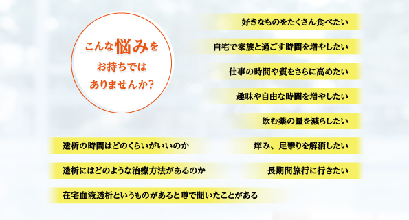 お問合せいただく方のなかには、『在宅血液透析』に興味がある方もいらっしゃいます。