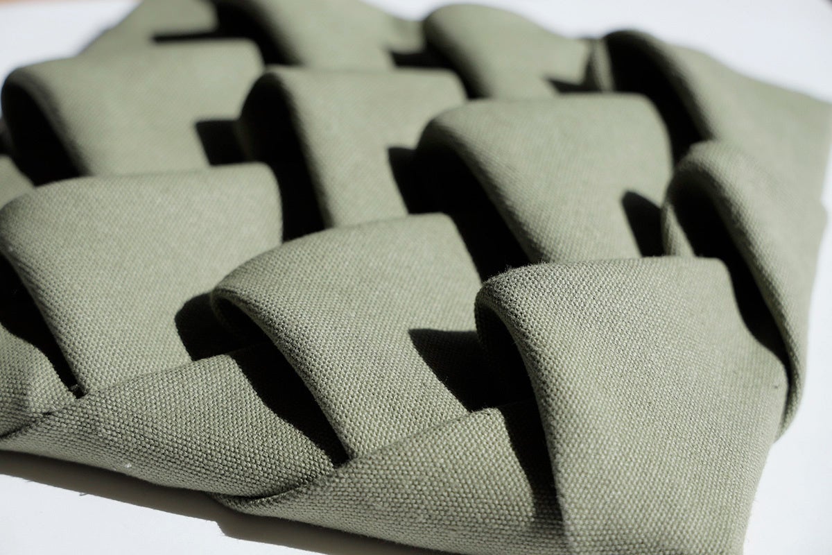 青々と茂った蔦の葉を想起させる表情は、ヘンプ生地を使いハンドクチュールで制作されています。まるで森の木ような働きのある機能するボタニカルモチーフのウォールアートです。