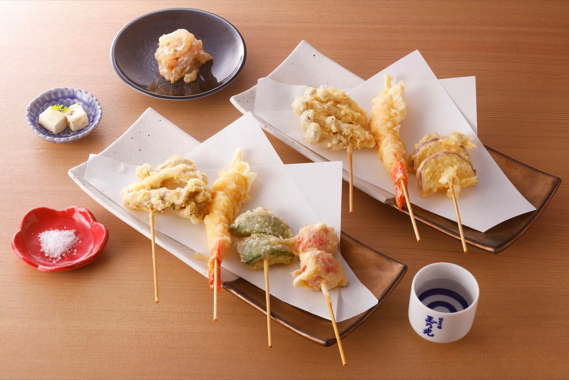 粉状の酒粕を入れた串天ぷらは、特製「酒粕塩」を添えて提供。